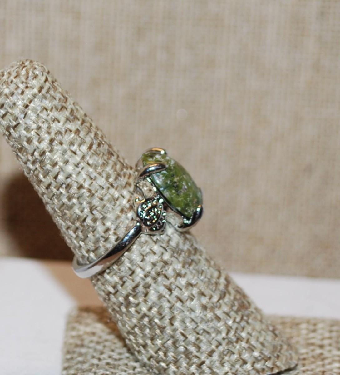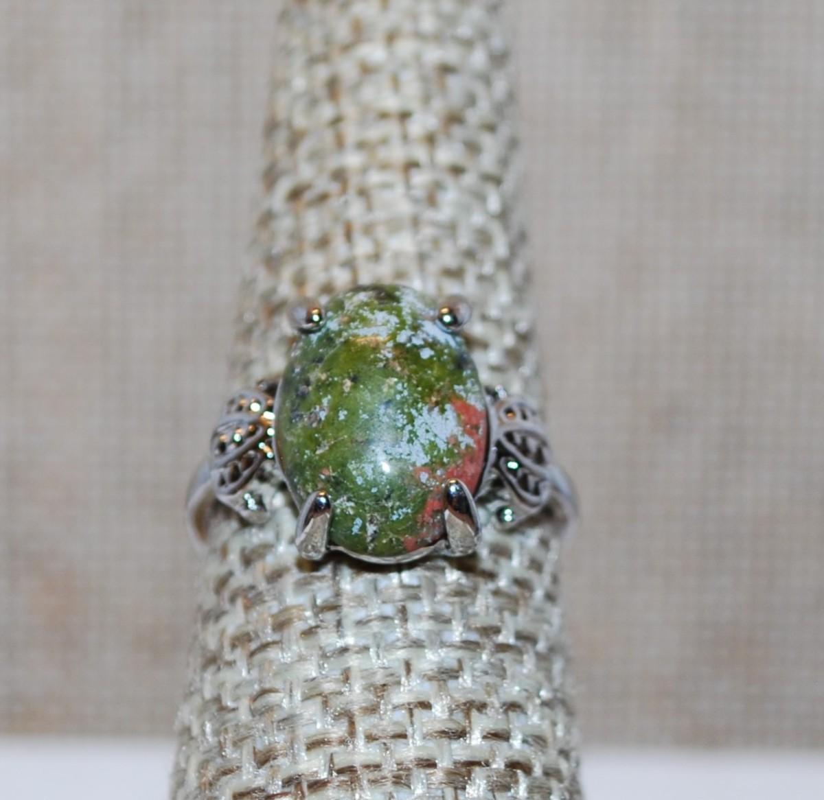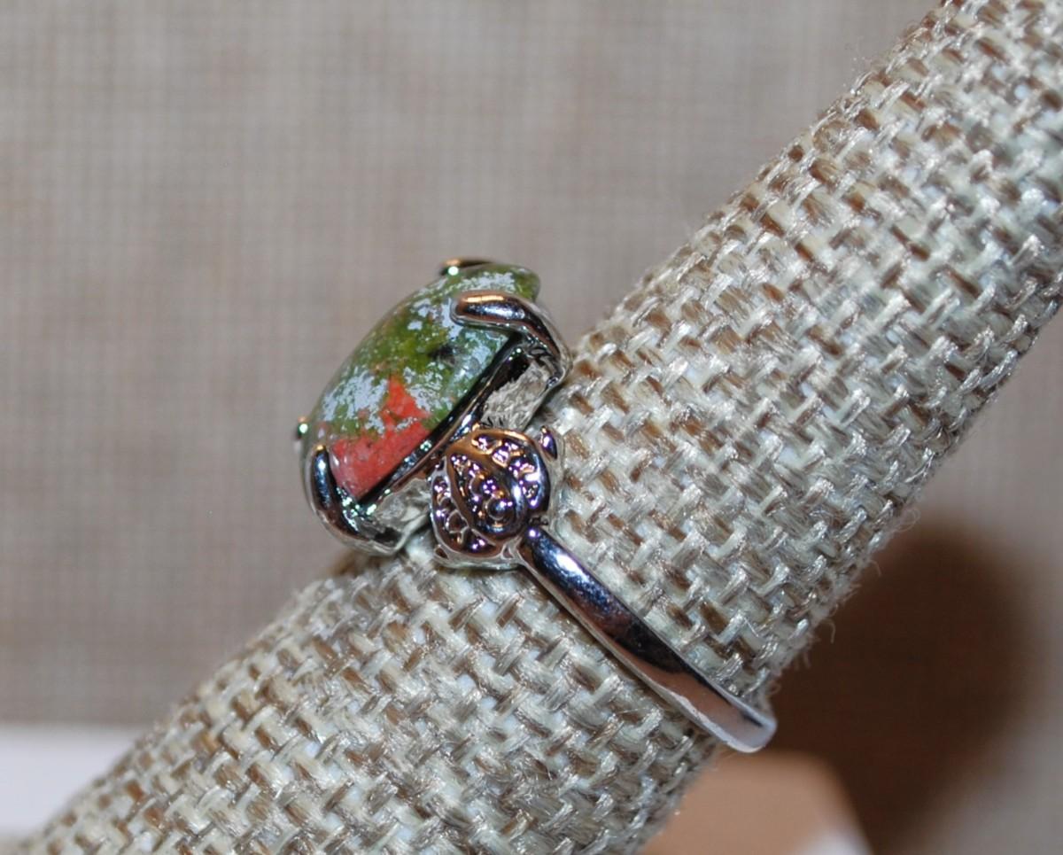 Size 6½ Orange & Green Oval Agate Stone Ring with Side Spheres Accents on a Silver Tone Band (3.6g)