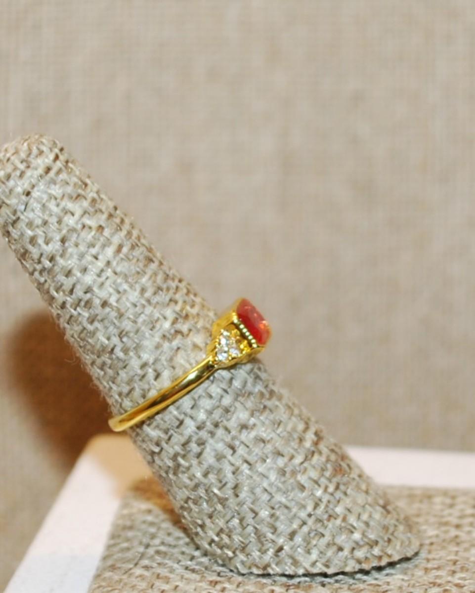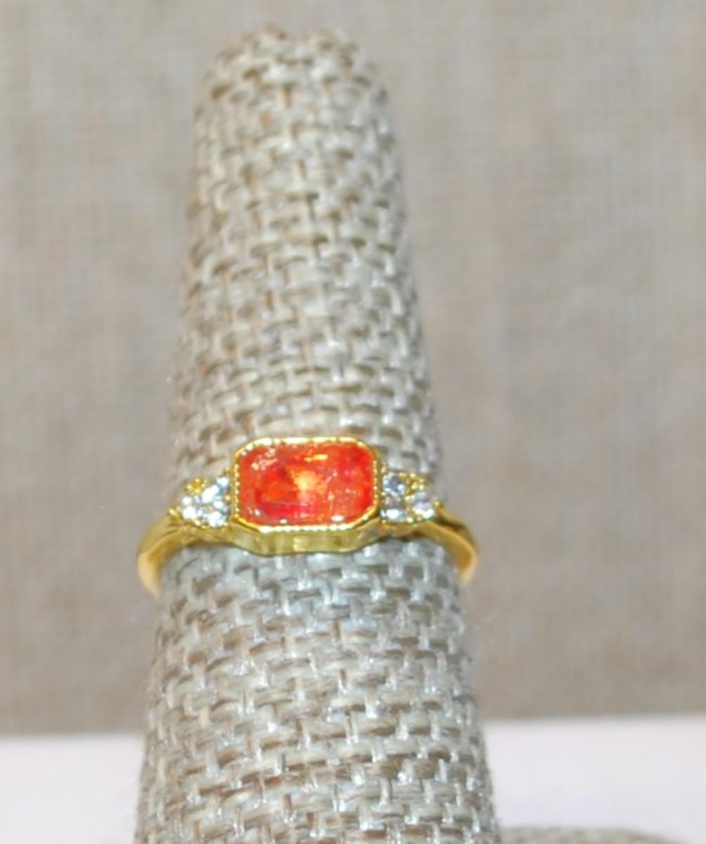Size 6¾ Orange Horizontal Rectangle Ring with Triple Clear Stone Sides on a Gold Tone Band (2.1g)