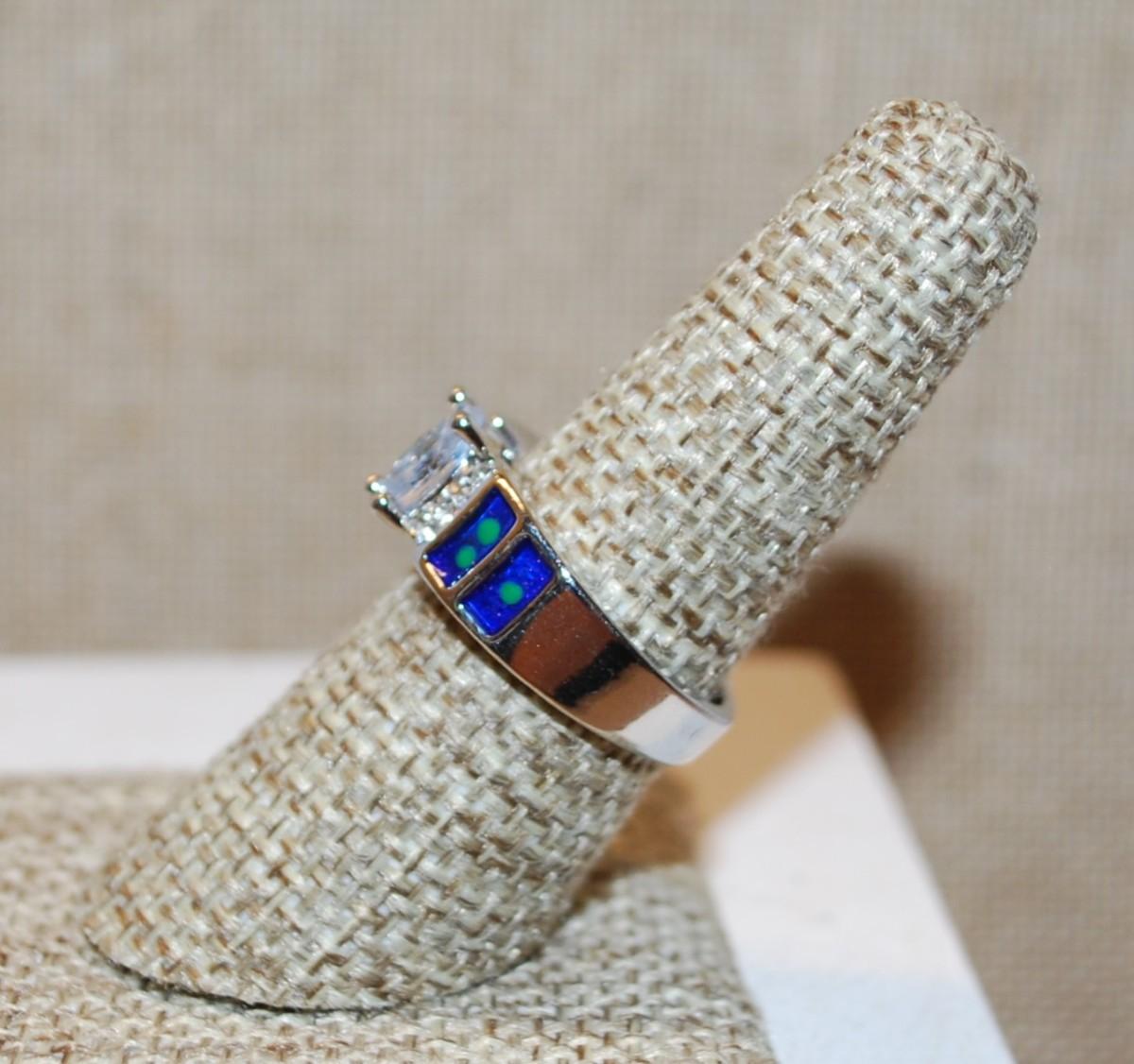 Size 6½ Oval Clear Stone Ring Marked .925 with Blue/Green Side Rectangular Panels on a Silver Band (5.0g)