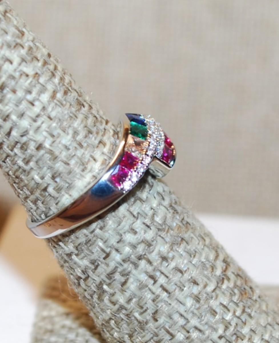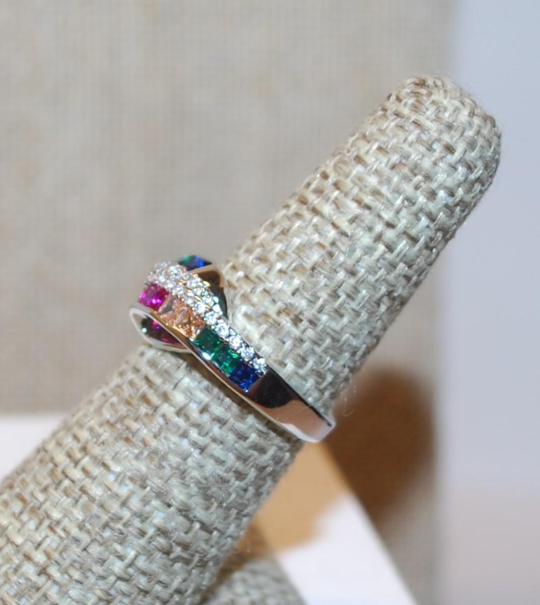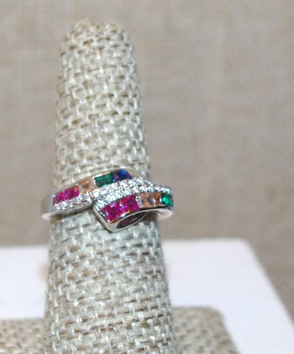 Size 6 Overlap Style Ring with Red, Green, Blue & Champagne Colored Stones on a Silver Tone Band (3.5g)