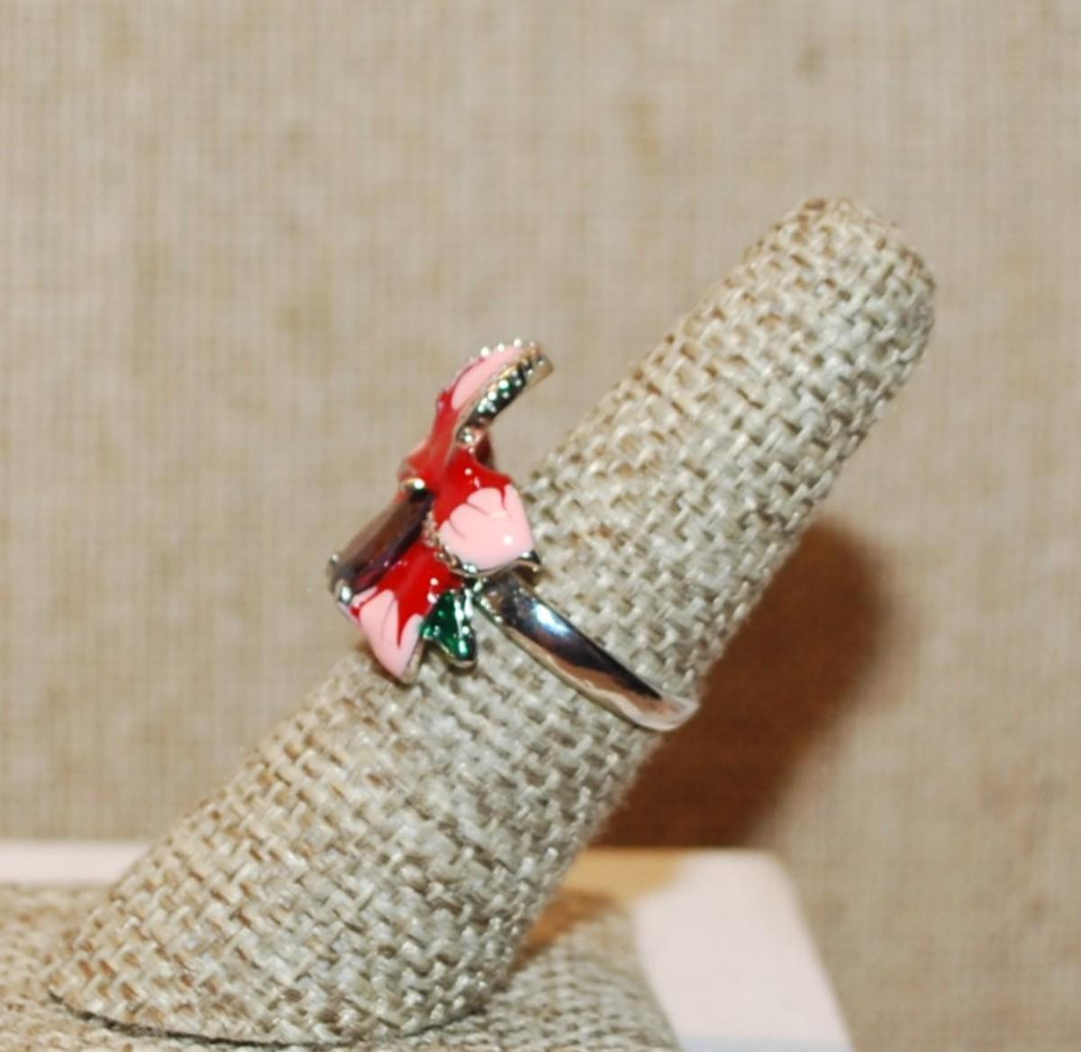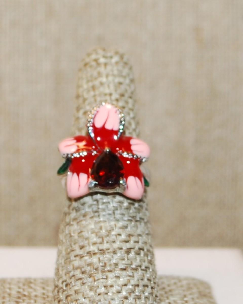 Size 6 Pink & Red Enamel Style Ring with Red Pear Main Stone on a Silver Tone Band (5.3g)