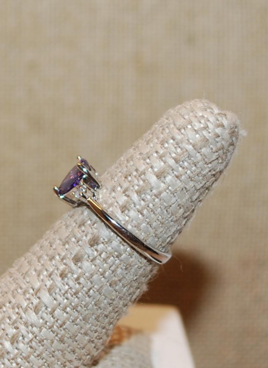 Size 6 PURPLE HEART 3 Prong Stone Ring with 2 Round Clear Stone Sides on a Silver Band (1.9g)