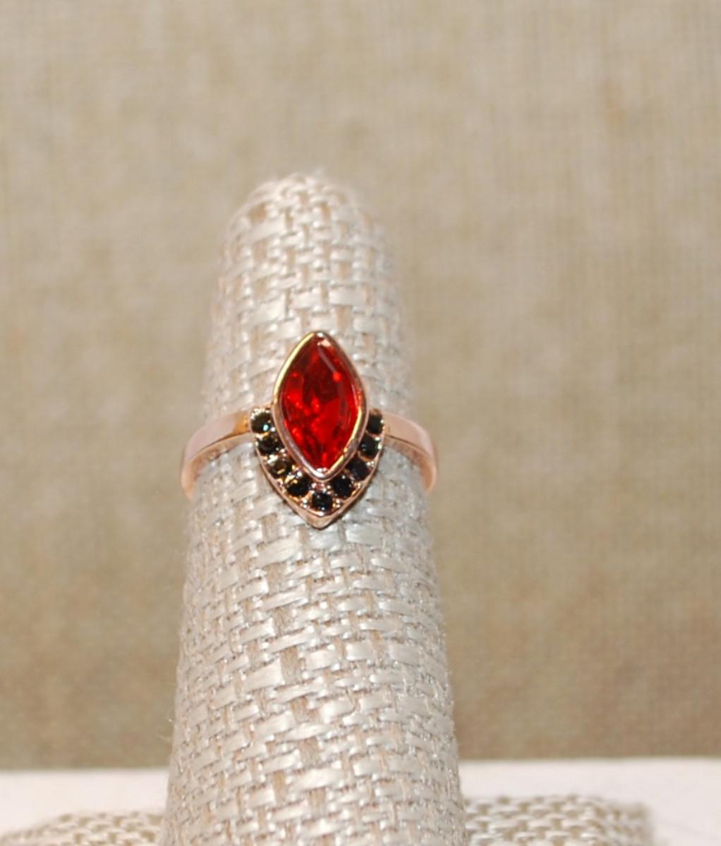 Size 6 Red Marquise Cut Stone Ring & 9 Black Accent Stones on a Gold Tone Band (3.0g)