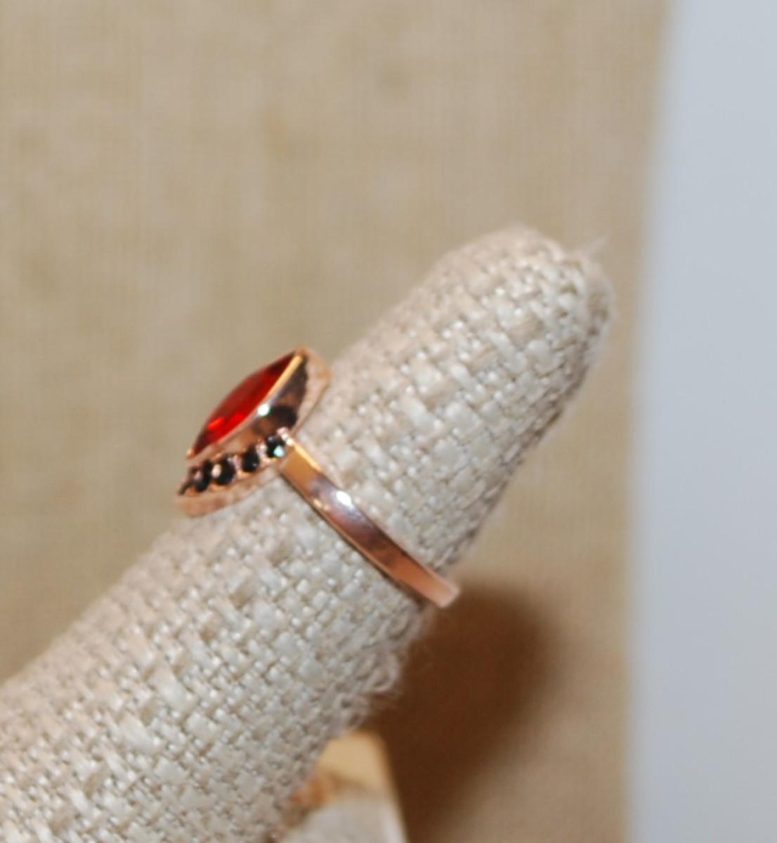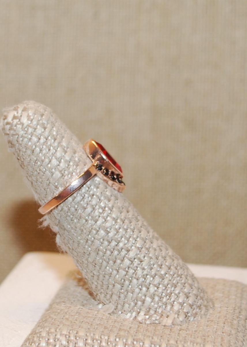 Size 6 Red Marquise Cut Stone Ring & 9 Black Accent Stones on a Gold Tone Band (3.0g)