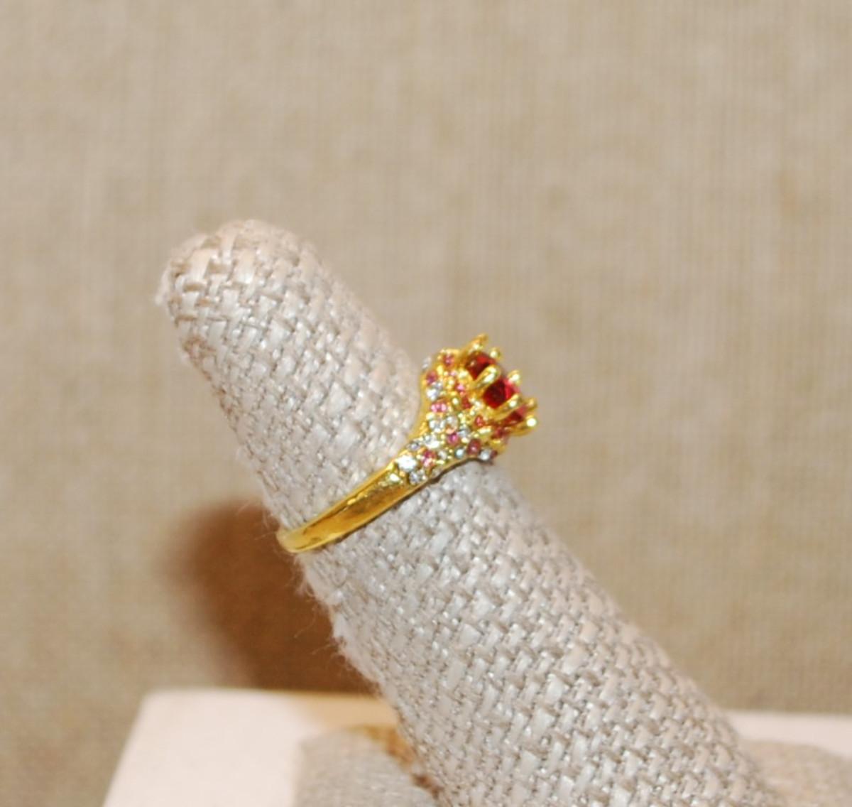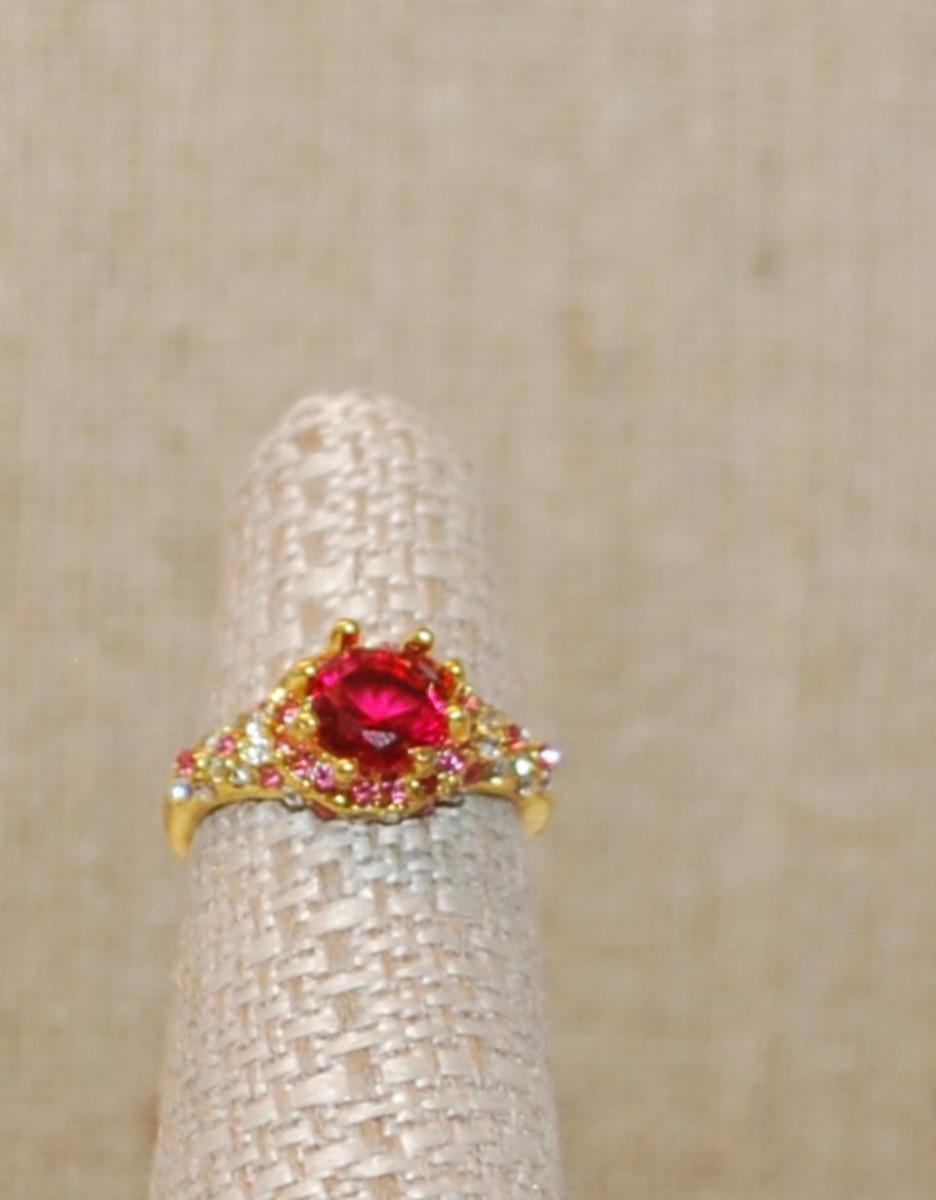 Size 6¼ Red Round Main 8 Prong Stone Ring with Clear & Red Accents Stones on a Gold Tone Band (2.7g)