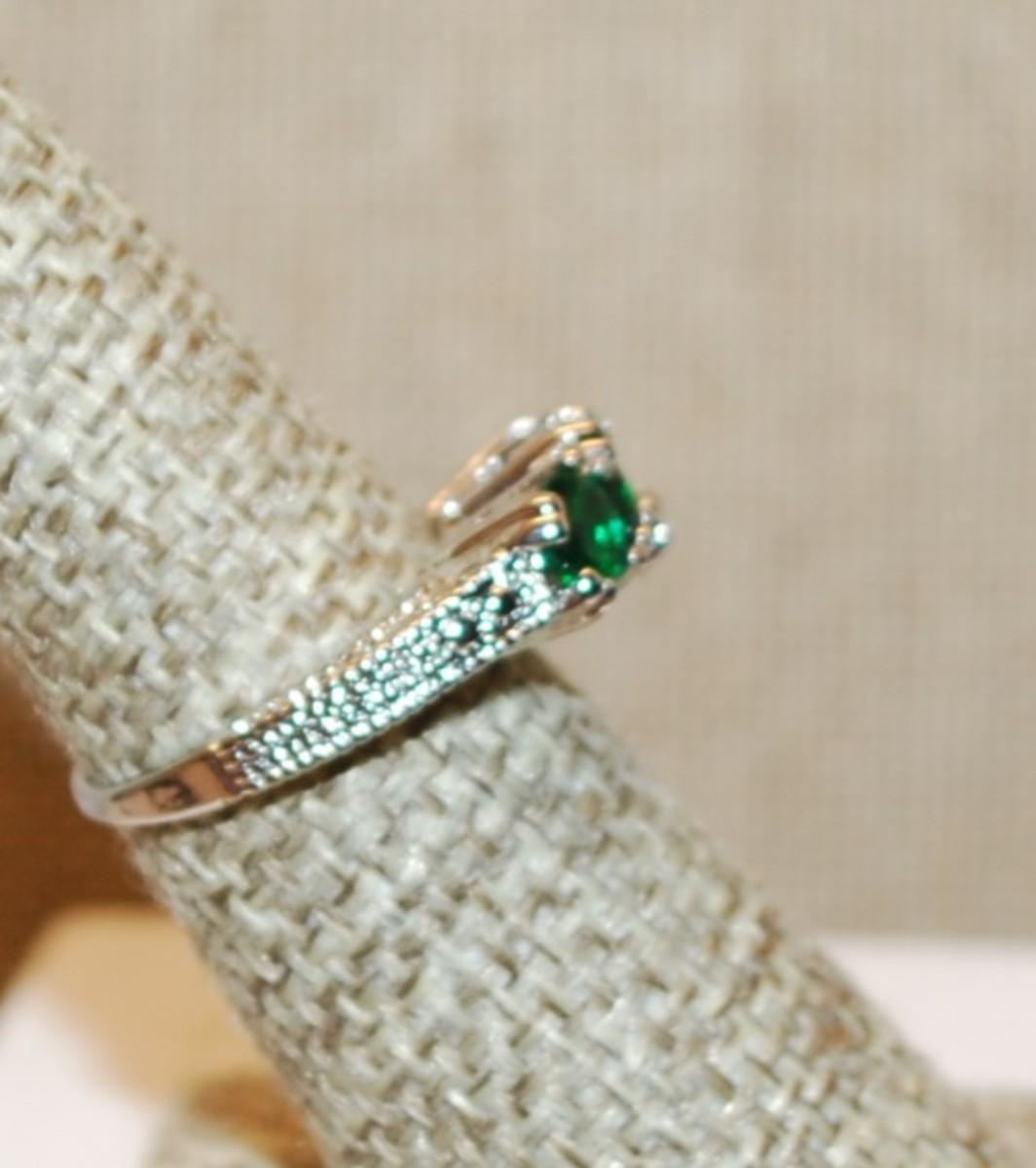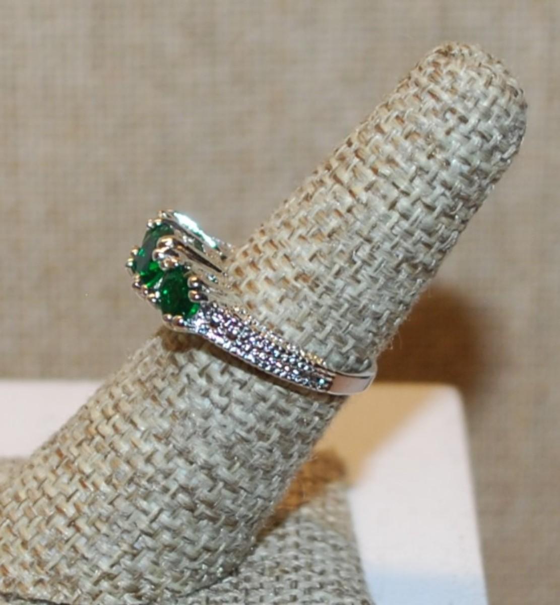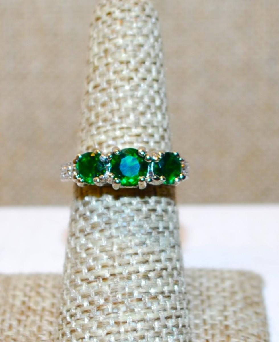 Size 6¼ Row of 3 Round Deep Green Stones Ring with a "Flat" Silver Tone Band (3.7g)