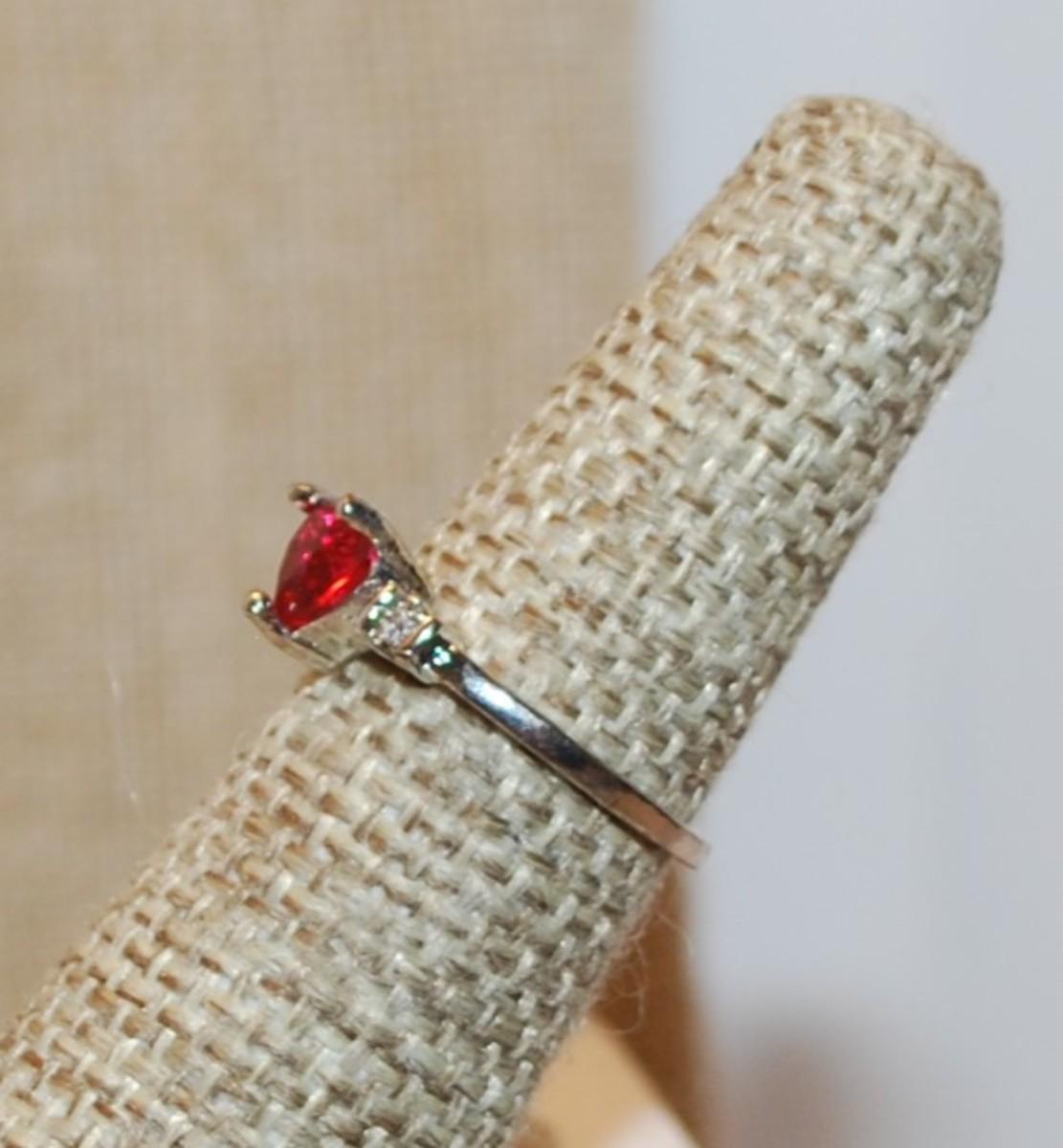 Size 6 Single Cranberry Red HEART Ring with 2 Clear Stones Side Accents on a Silver Tone Band (1.6g)