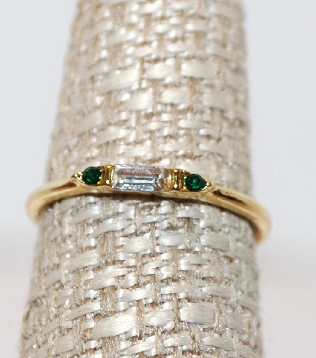Size 6¾ Small Emerald Cut Ring with Clear Main Stone & 2 Green Accent Stones on a Gold Tone Band (1.3g)