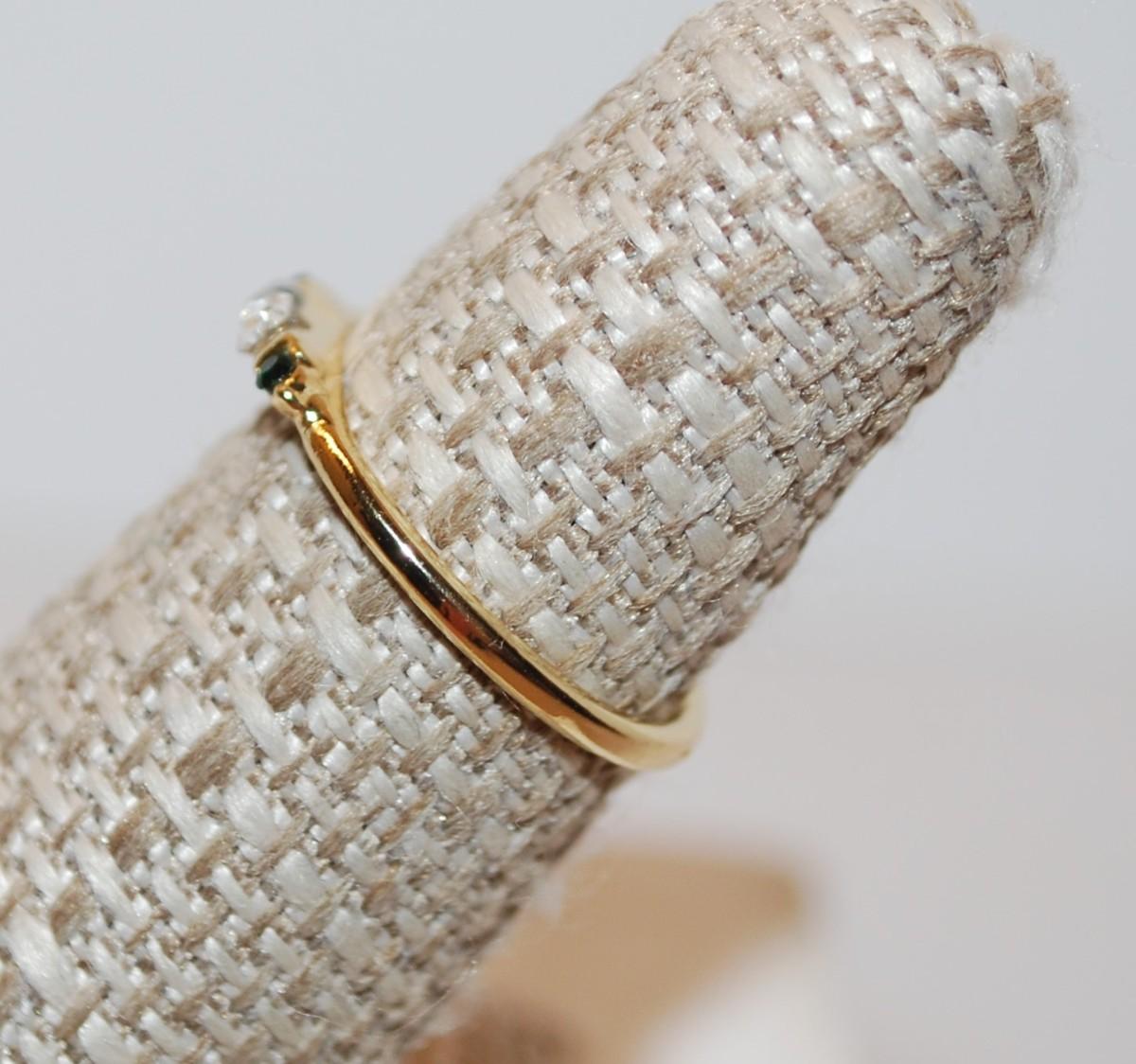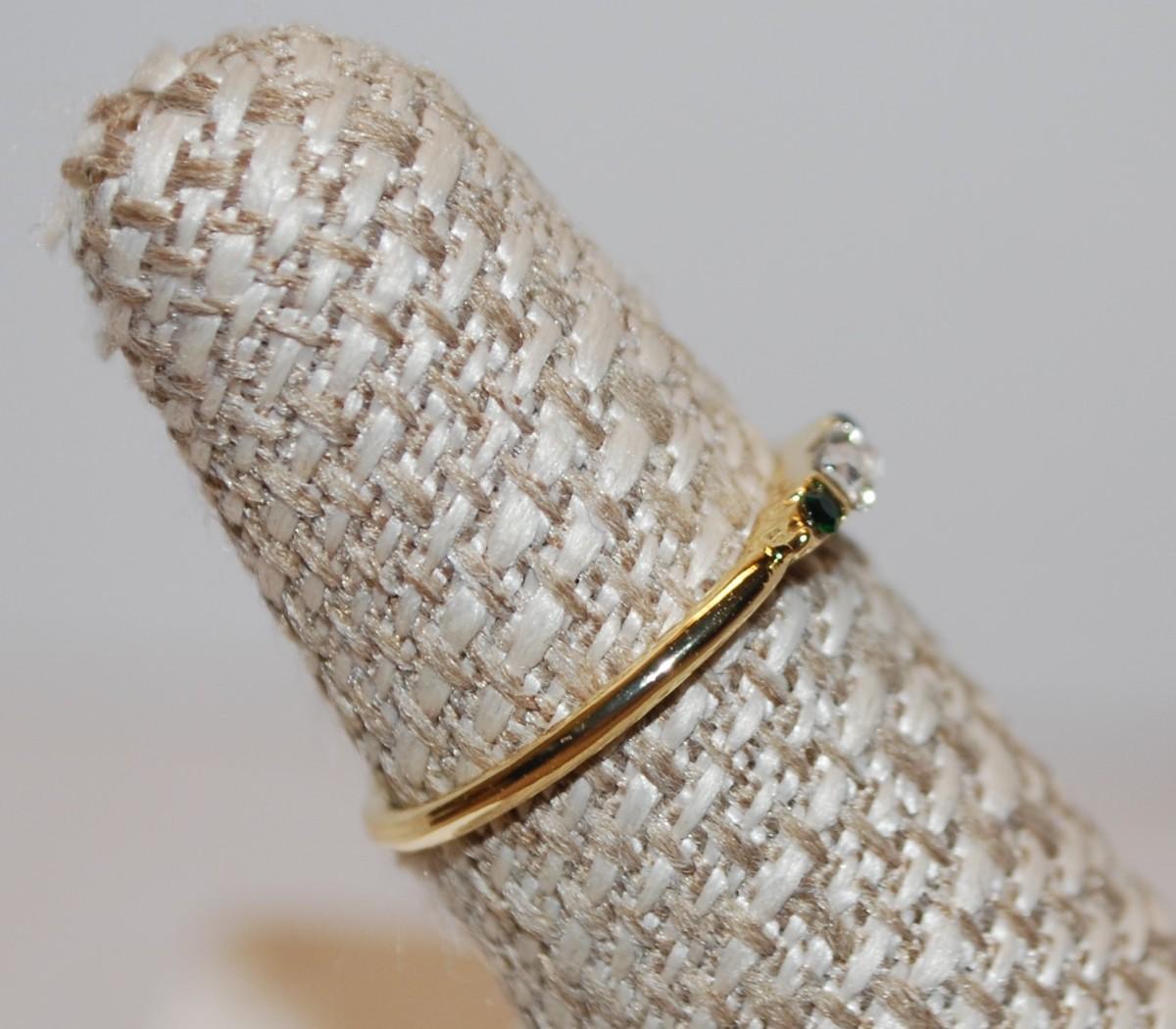 Size 6¾ Small Emerald Cut Ring with Clear Main Stone & 2 Green Accent Stones on a Gold Tone Band (1.3g)