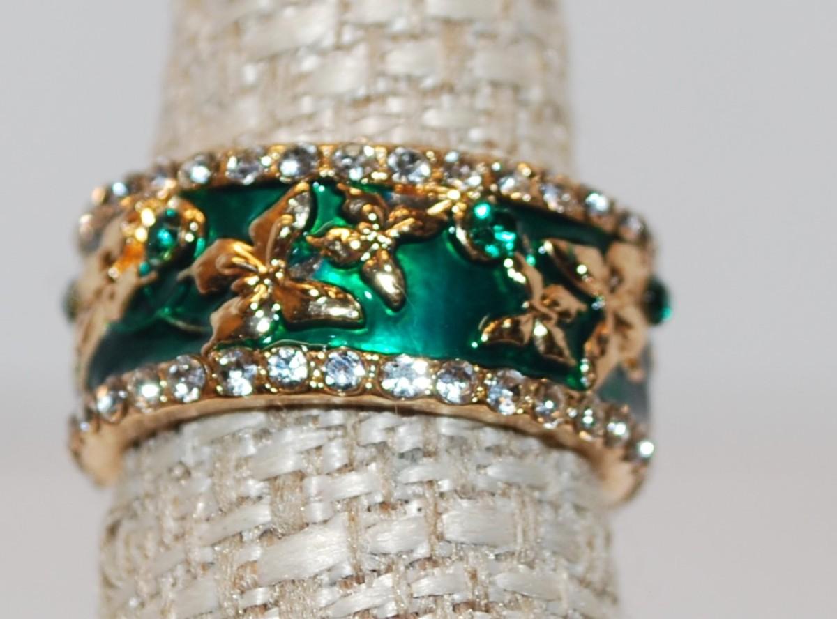 Size 6¾ Sterling Silver .925 Butterflies in Green Enamel Style Inlay Ring with Tiny Clear Stone Edges (5.6g)