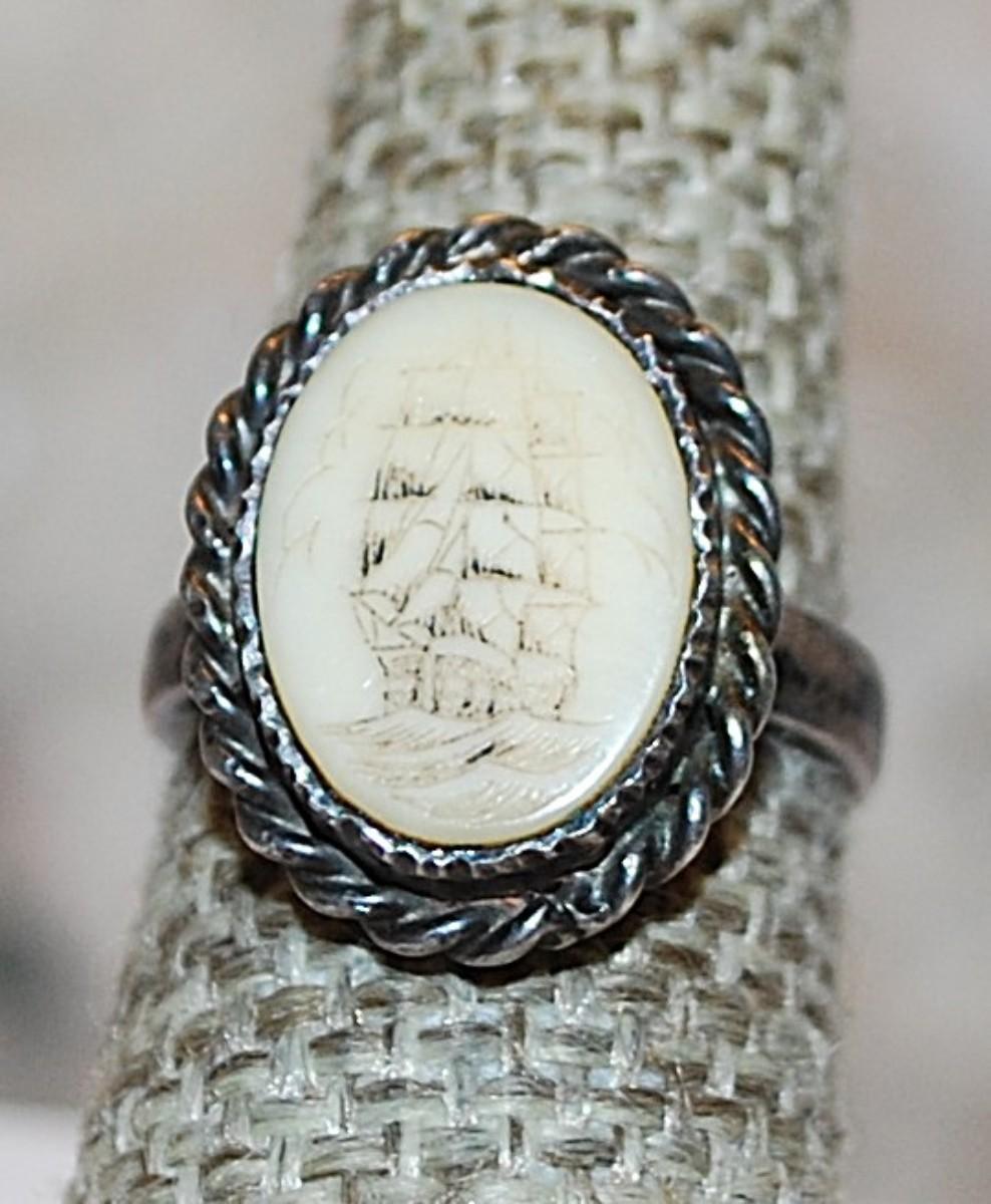 Size 6 Vintage Oval "Sailing Ship" Ring on a Rope Style Silver Tone Setting (6.5g)