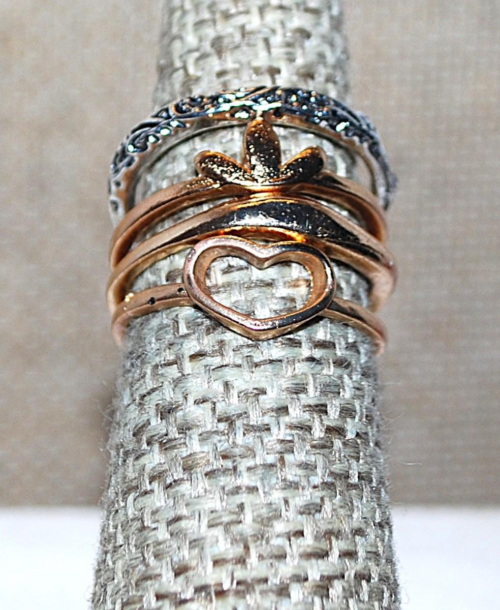 Size 6-6½ Collection of 4 RINGS - 1 Silver Tone, Rough Cut Band; 3 Gold Tone, Heart, Flower & Simple (4.6g)