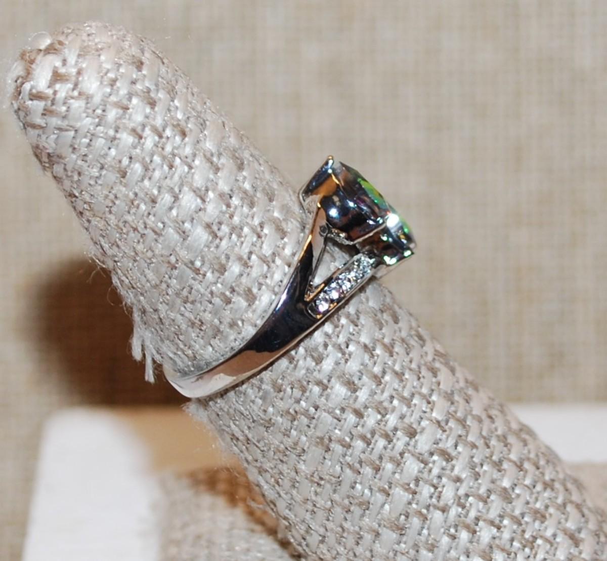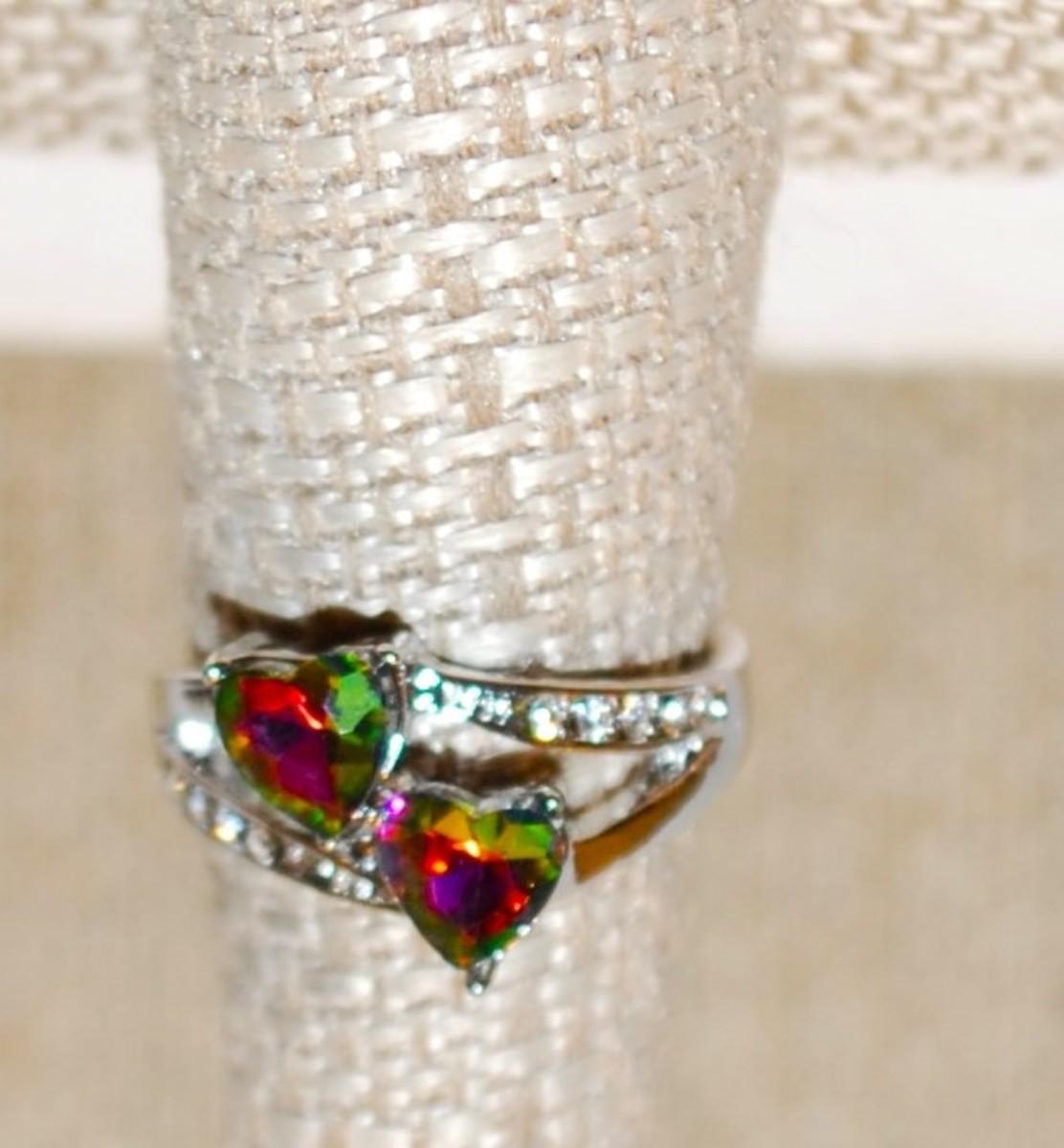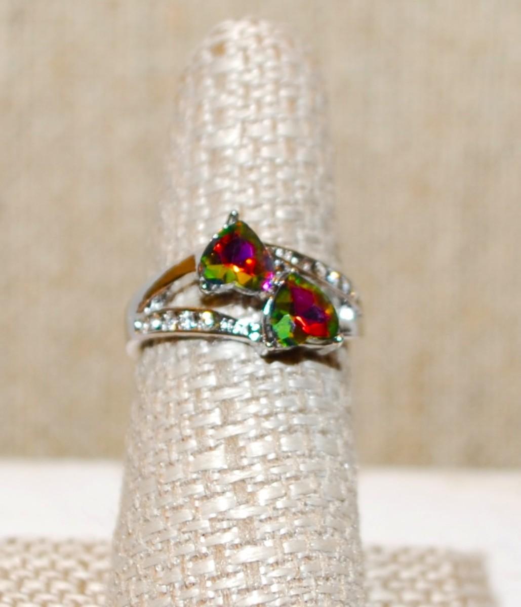 Size 7¾ Tiered Rainbow Topaz Iridescent Heart Shaped Stones Ring with Accents on a Silver Tone Band (3.1g)