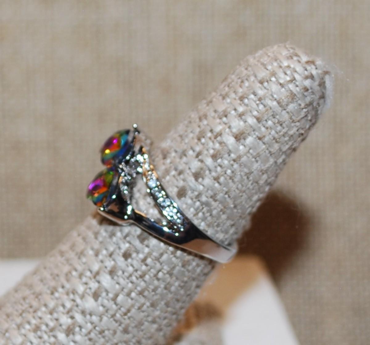 Size 7¾ Two Tiered Rainbow Topaz Iridescent Heart Shaped Stones Ring with Accents on a Silver Tone Band (3.1g)