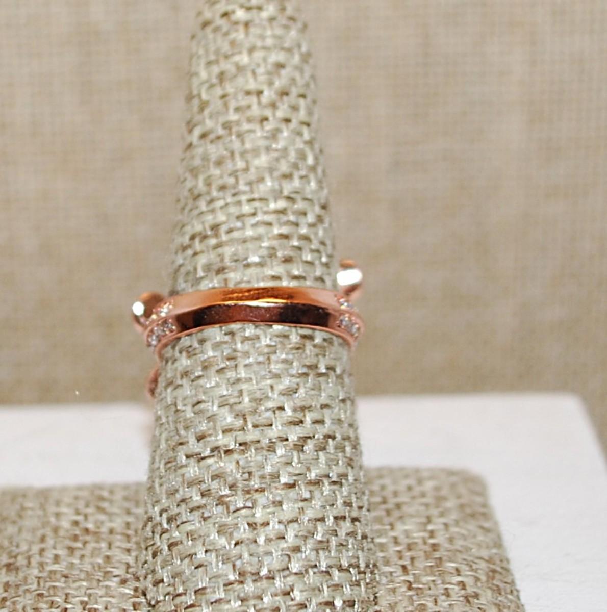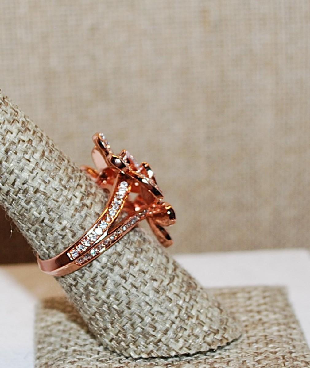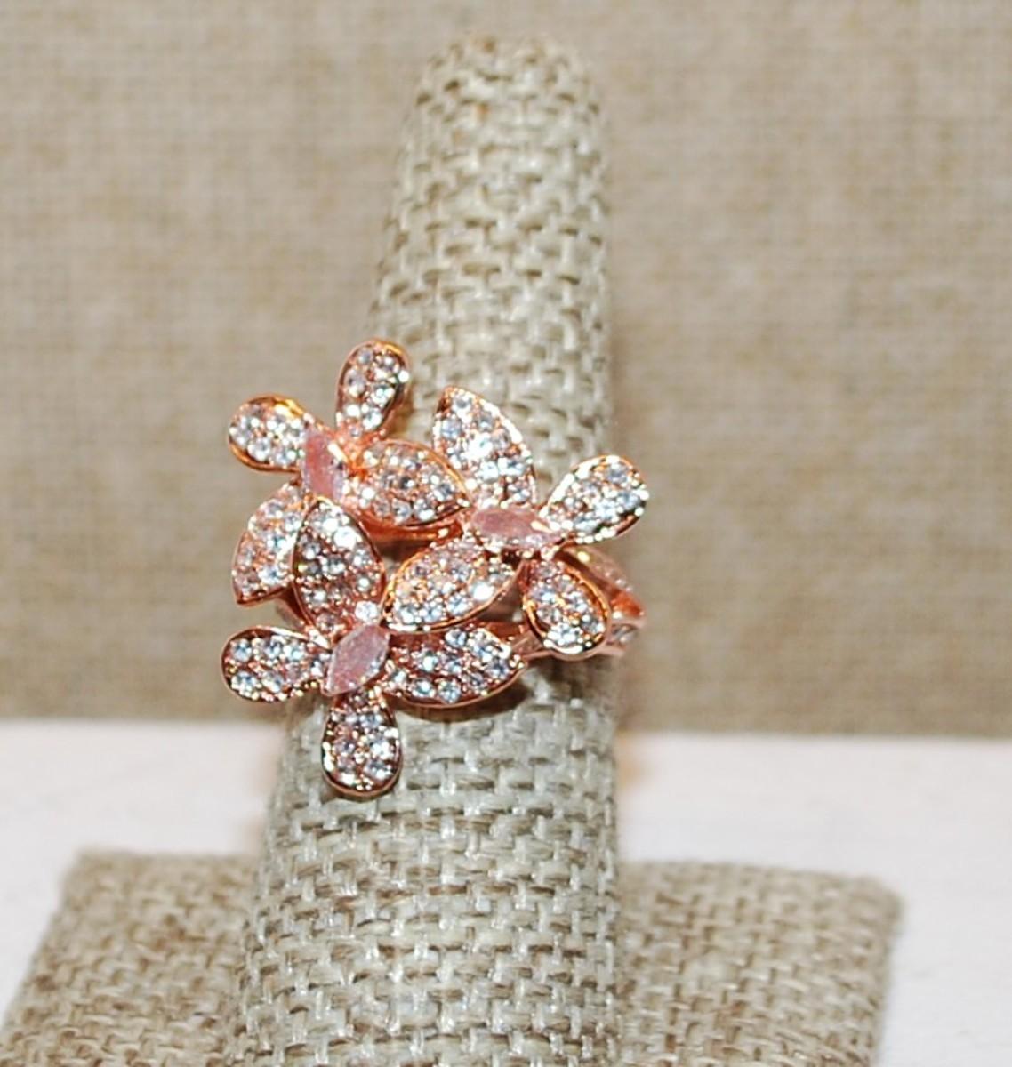 Size 7 ½ Triple Flower Petals Brilliant Stones Party Ring on a Glittery ROSE GOLD Tone Band (7.0g)