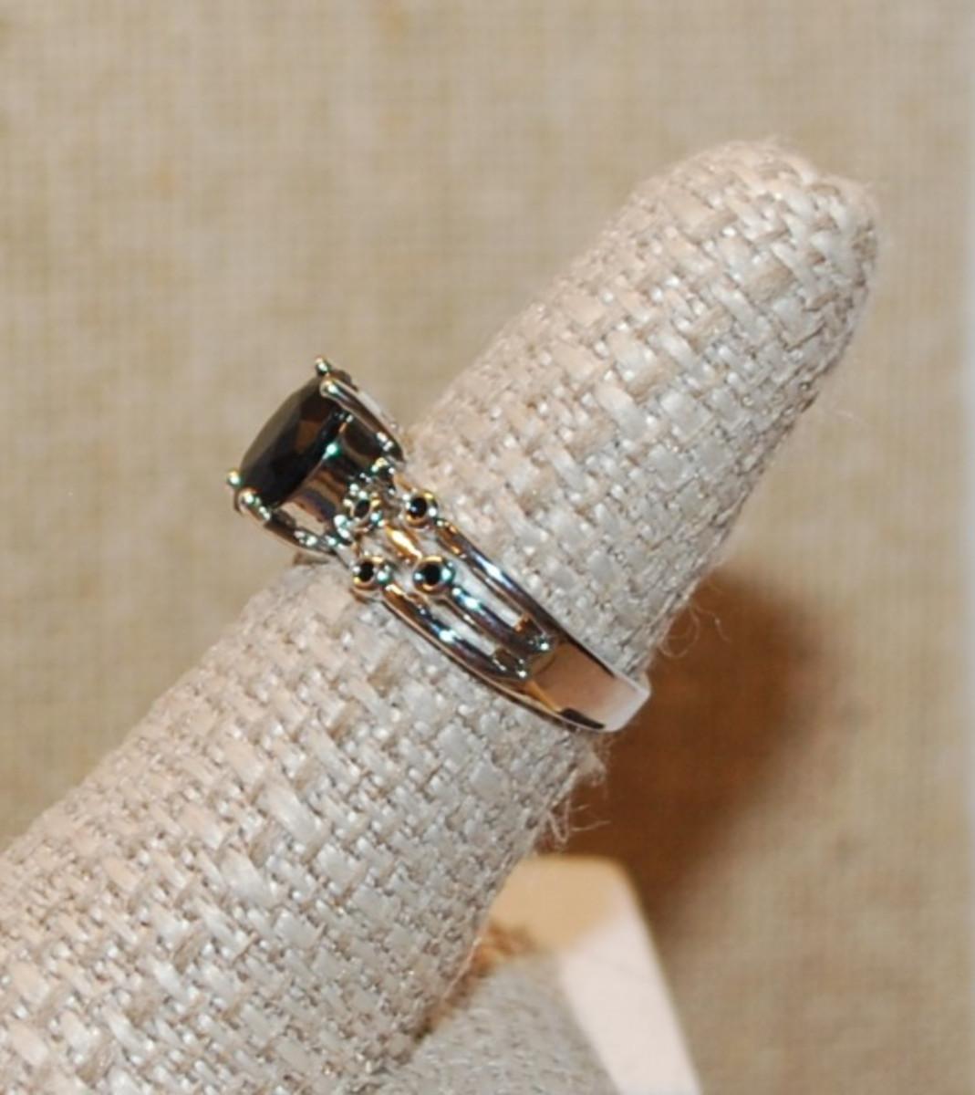 Size 7 All Black Oval Stone Ring with 8 Tiny Encircled Black Stones on a Silver Tone Band ( 3.3g)