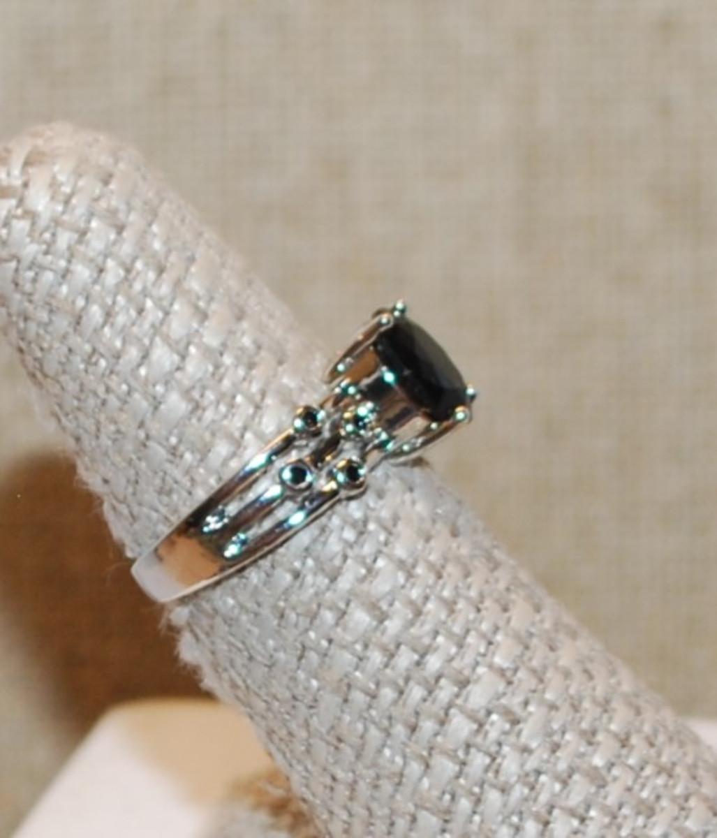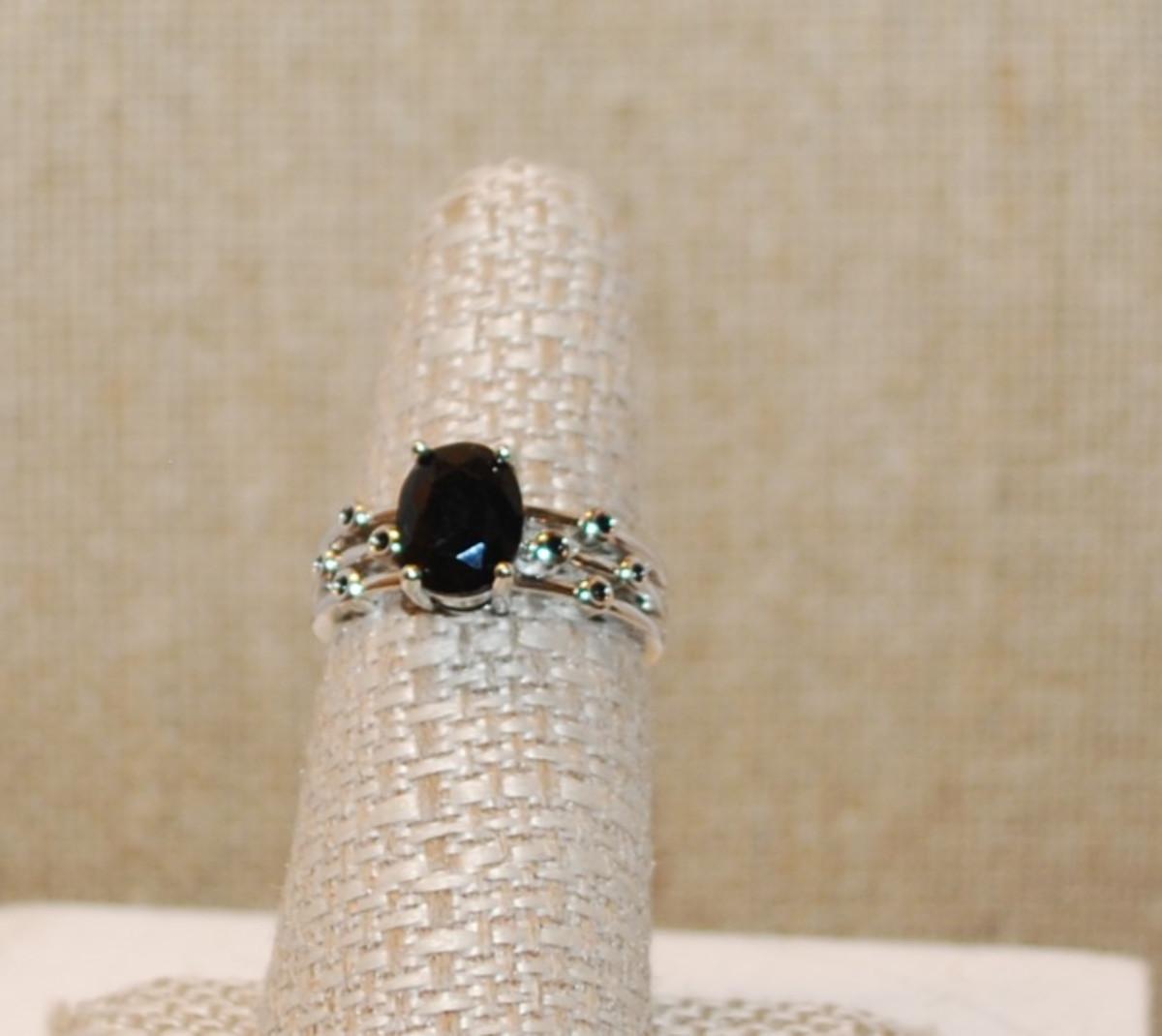 Size 7 All Black Oval Stone Ring with 8 Tiny Encircled Black Stones on a Silver Tone Band ( 3.3g)