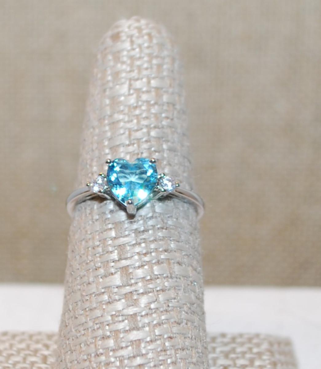 Size 7 AQUAMARINE HEART 3 Prong Stone Ring with 2 Round Clear Stone Sides on a Silver Band (1.7g)