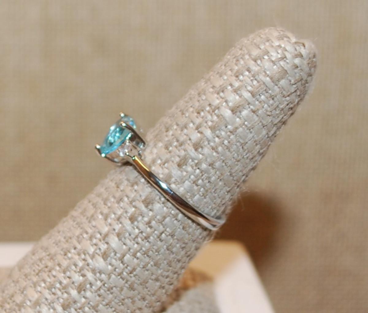 Size 7 AQUAMARINE HEART 3 Prong Stone Ring with 2 Round Clear Stone Sides on a Silver Band (1.7g)