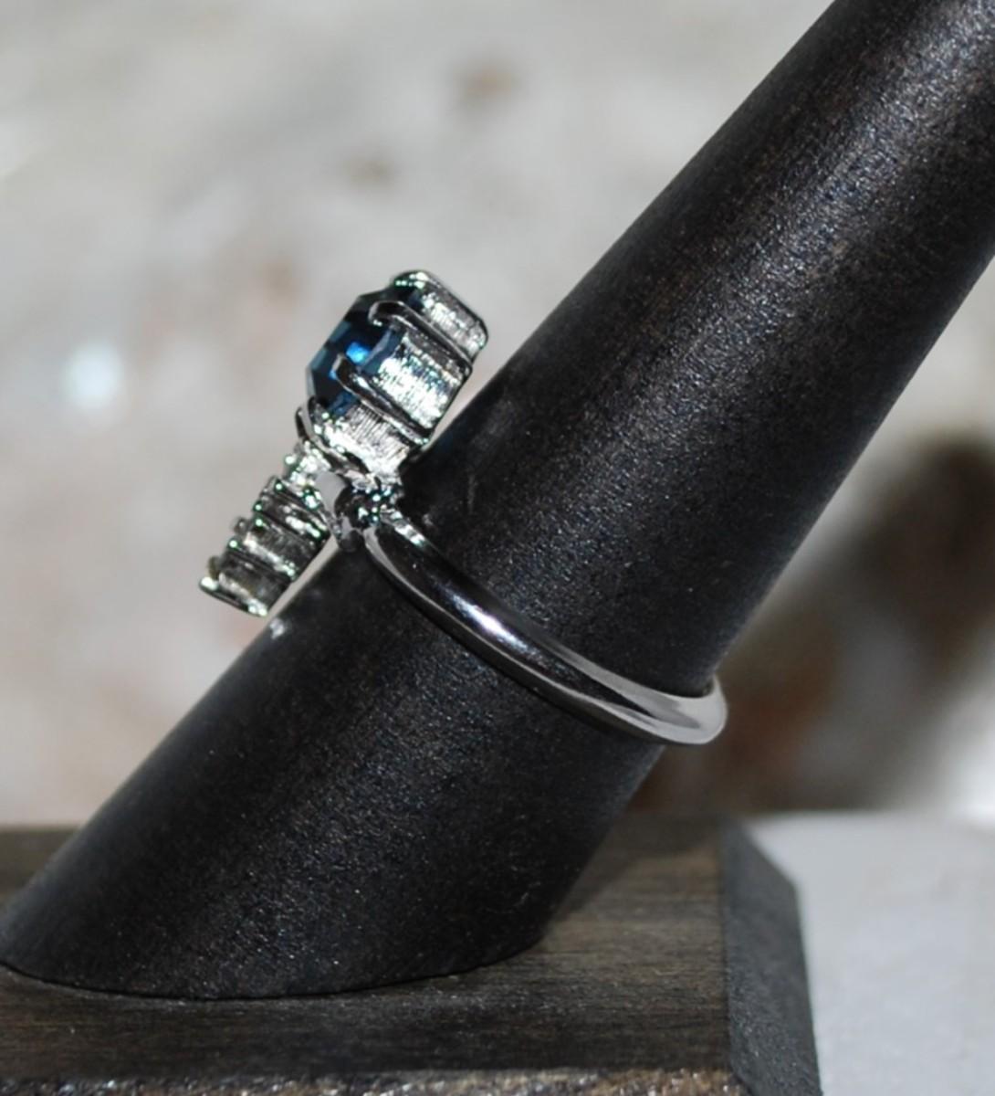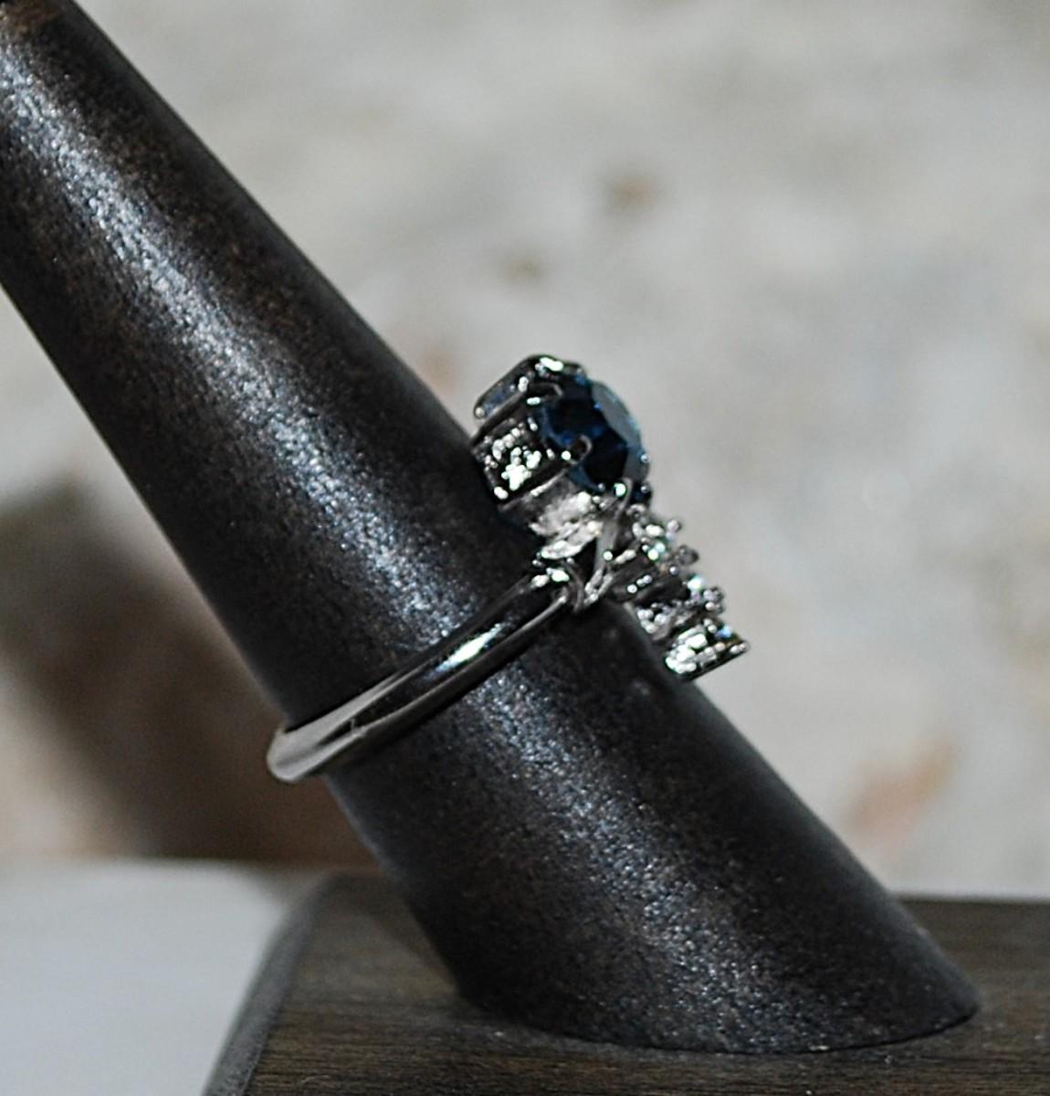 Size 7¾ Beautiful Deep BLUE Stone RING with 4 Clear Stones Dangle Accent on a Silver Tone Setting (3.5g)