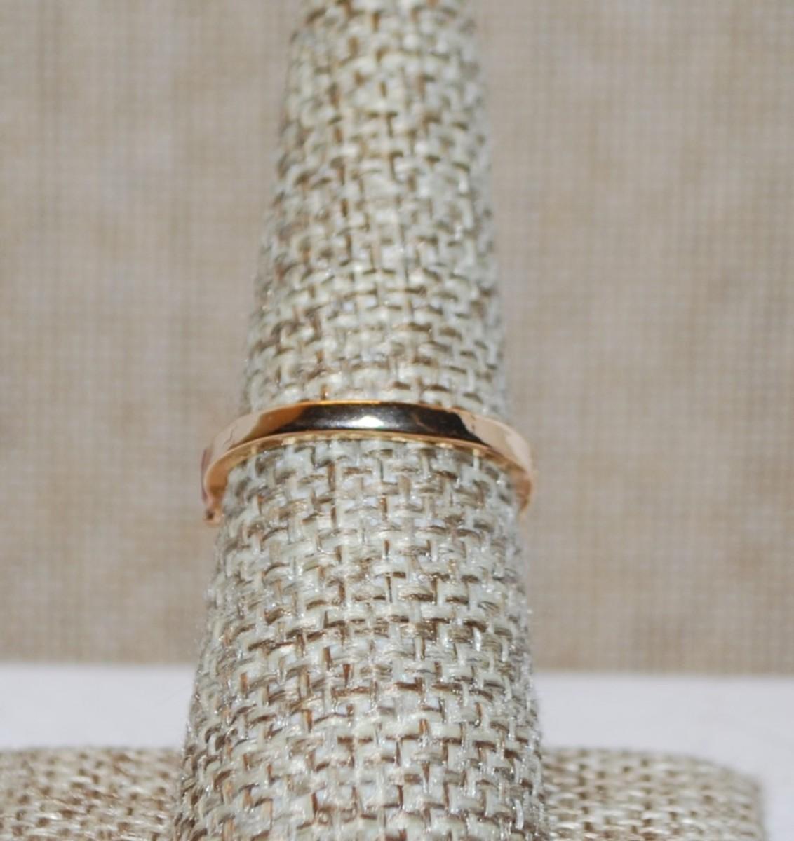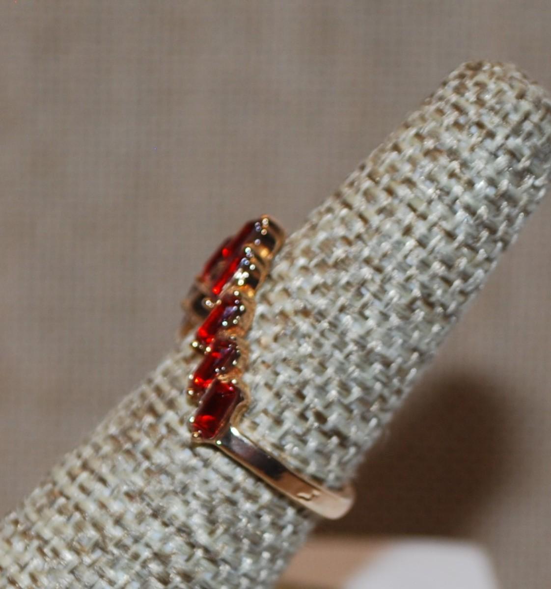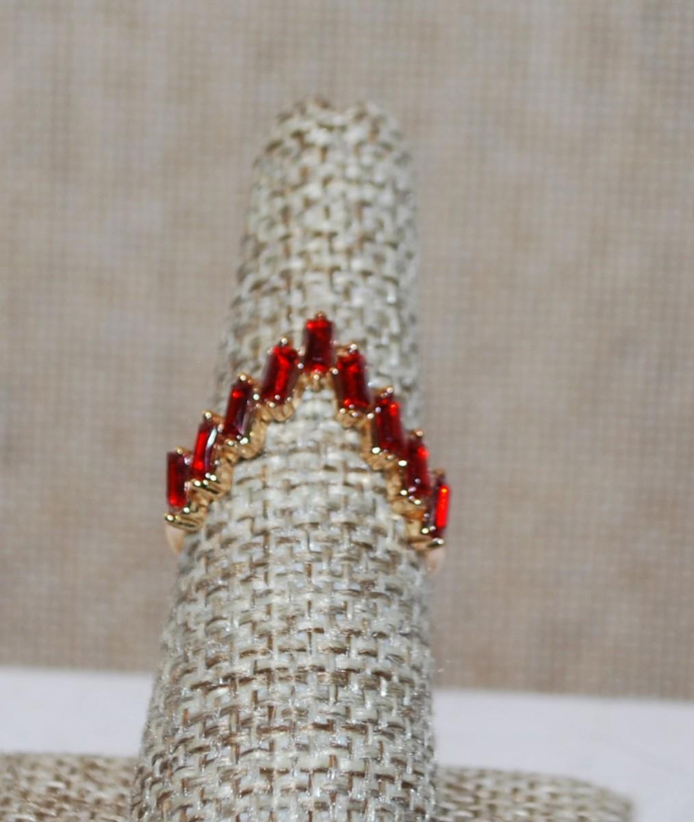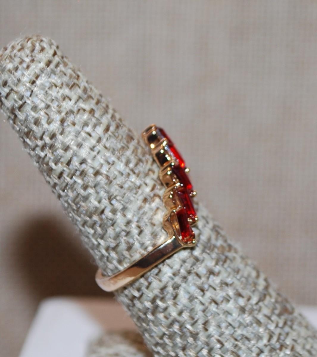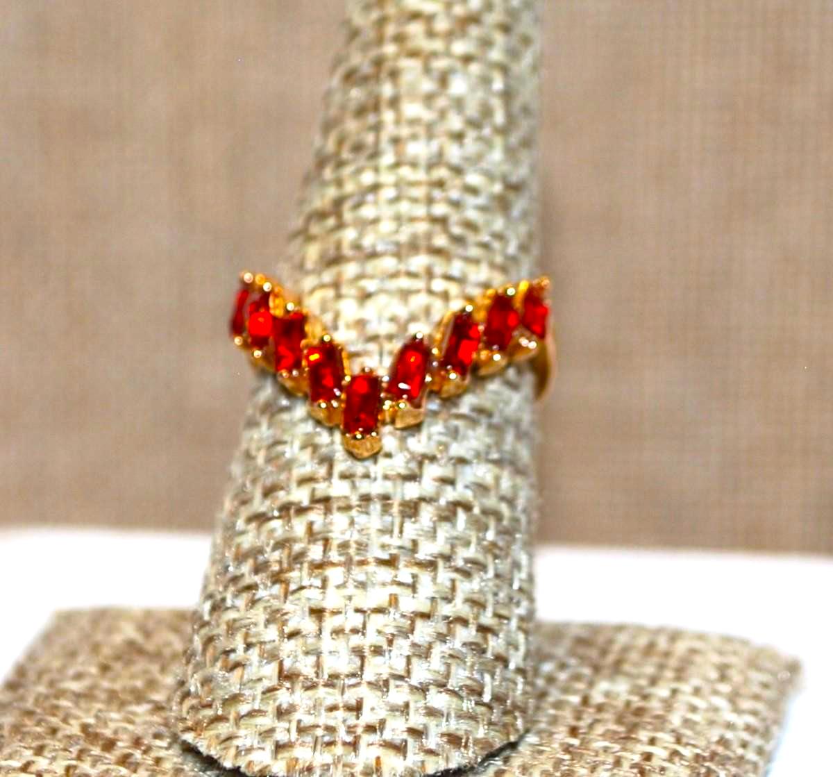 Size 7 Beautiful "V" Shaped Thin Emerald Style Cut Ring with Red Stones on a Gold Tone Band (2.3g)