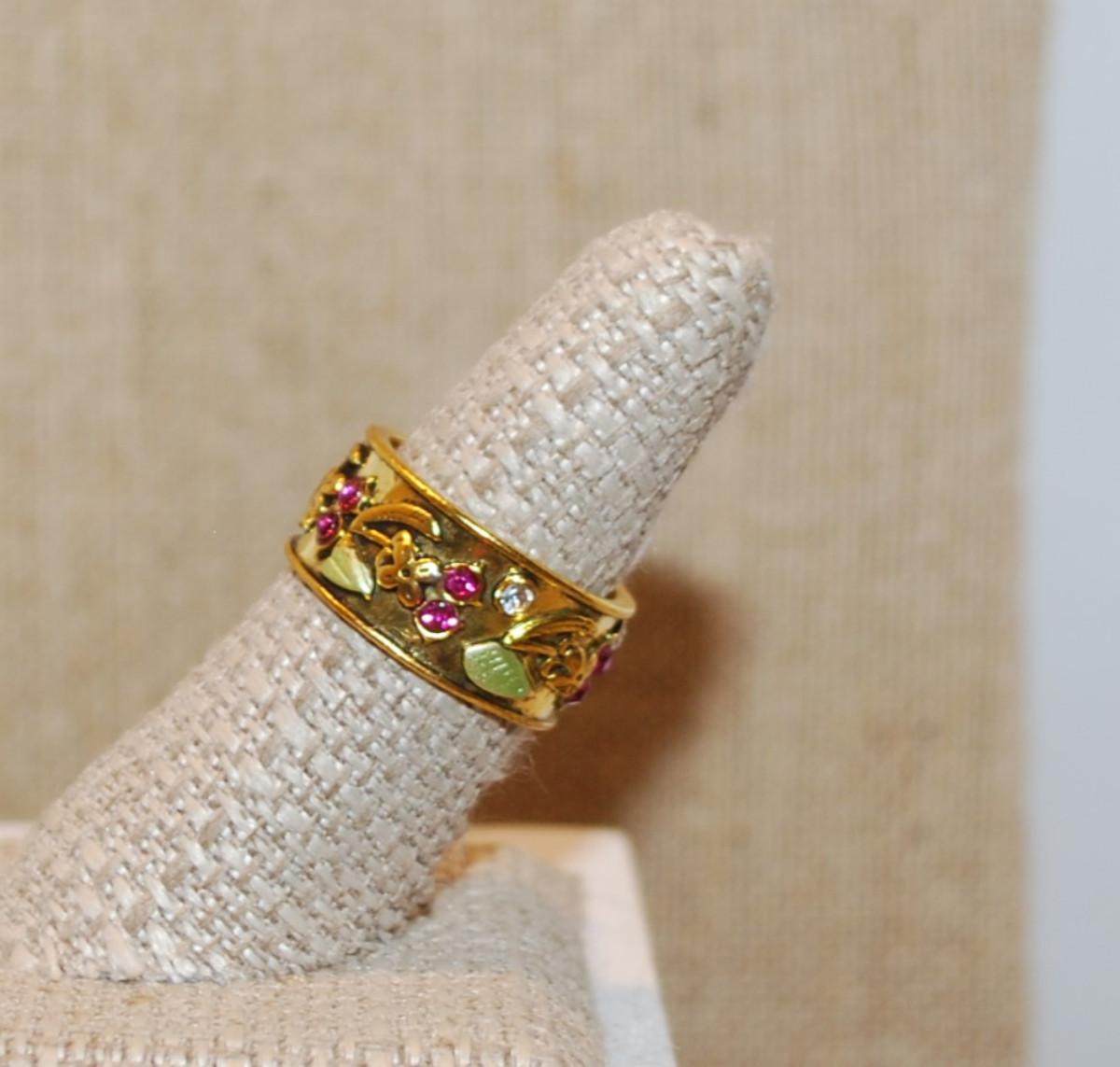 Size 7¾ "Black Hills" Style Gold Infinity Setting Ring with Green Leaves and Clear & Red Stones Band (6.8g)