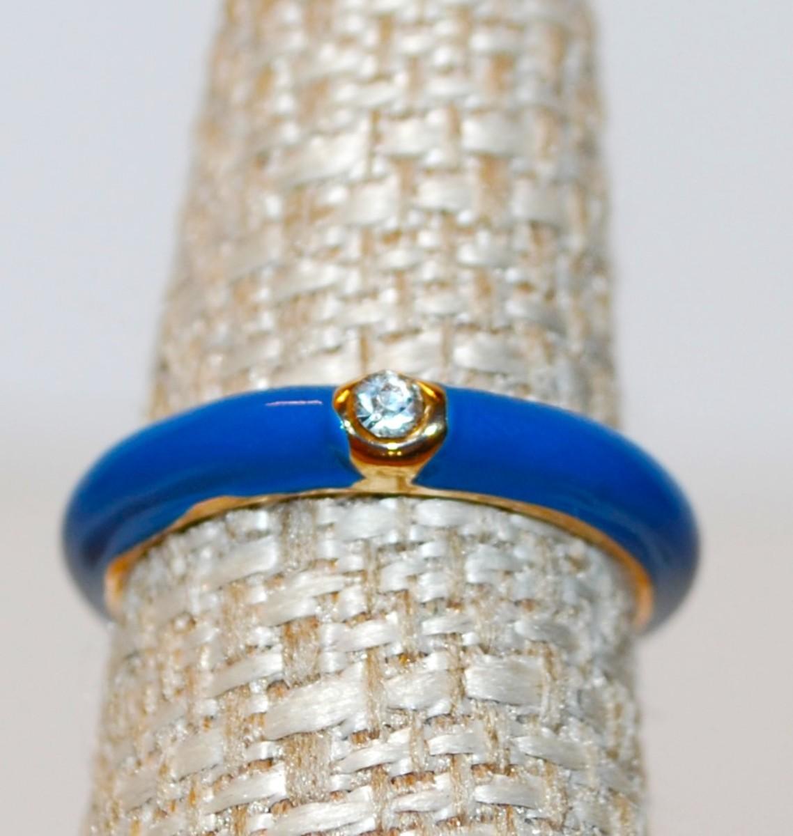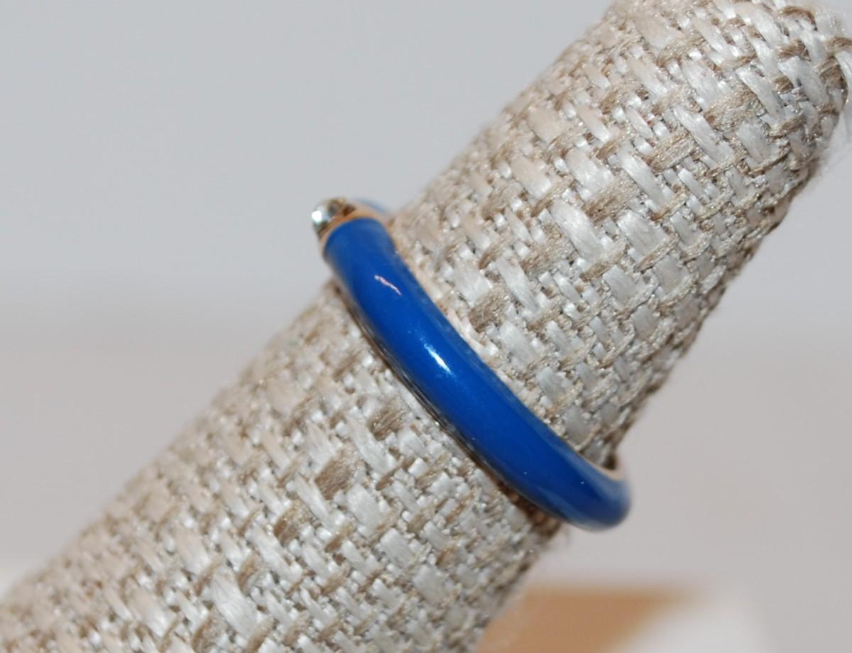 Size 7 Blue Enamel Ring with Solitaire Gold-Circled Clear Stone (3.1g)