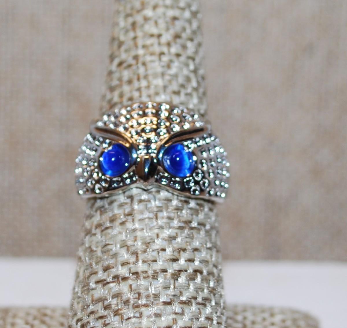 Size 7¼ Blue Eyed Owl Ring on a Shimmering Silver Tone Band (5.0g)