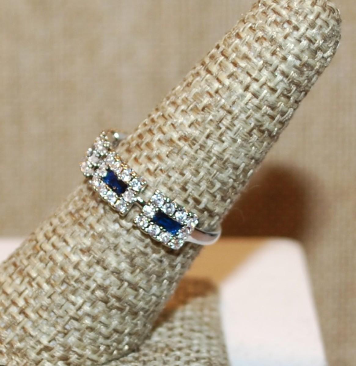 Size 7 Blue Stone Inserts Ring on 5 Rectangle Clear Stone Panels on a Silver Tone Band (3.1g)