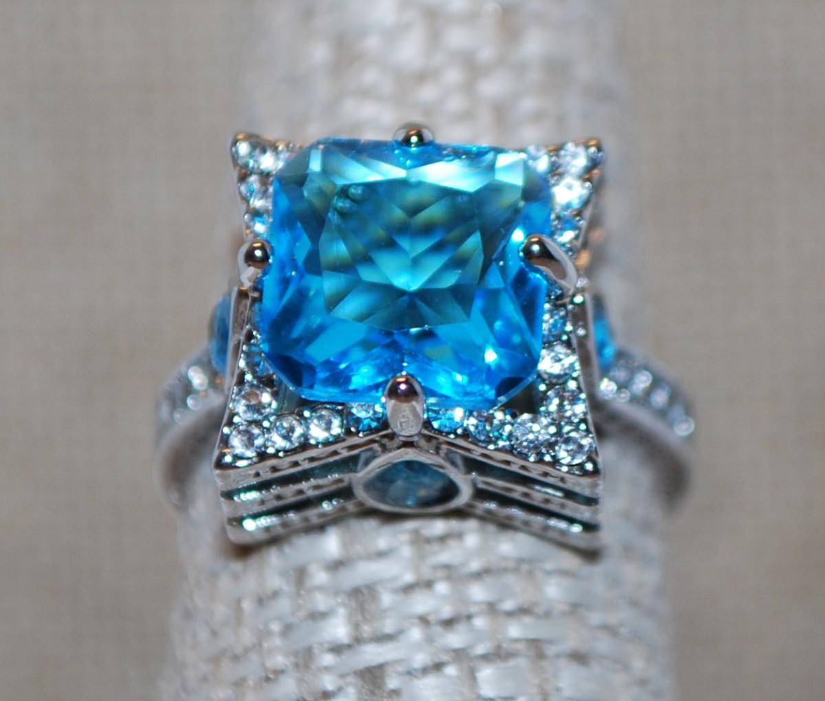 Size 7 Blue Stone Ring on Unique Triple Levels Setting and Silver Tone Band (7.7g)
