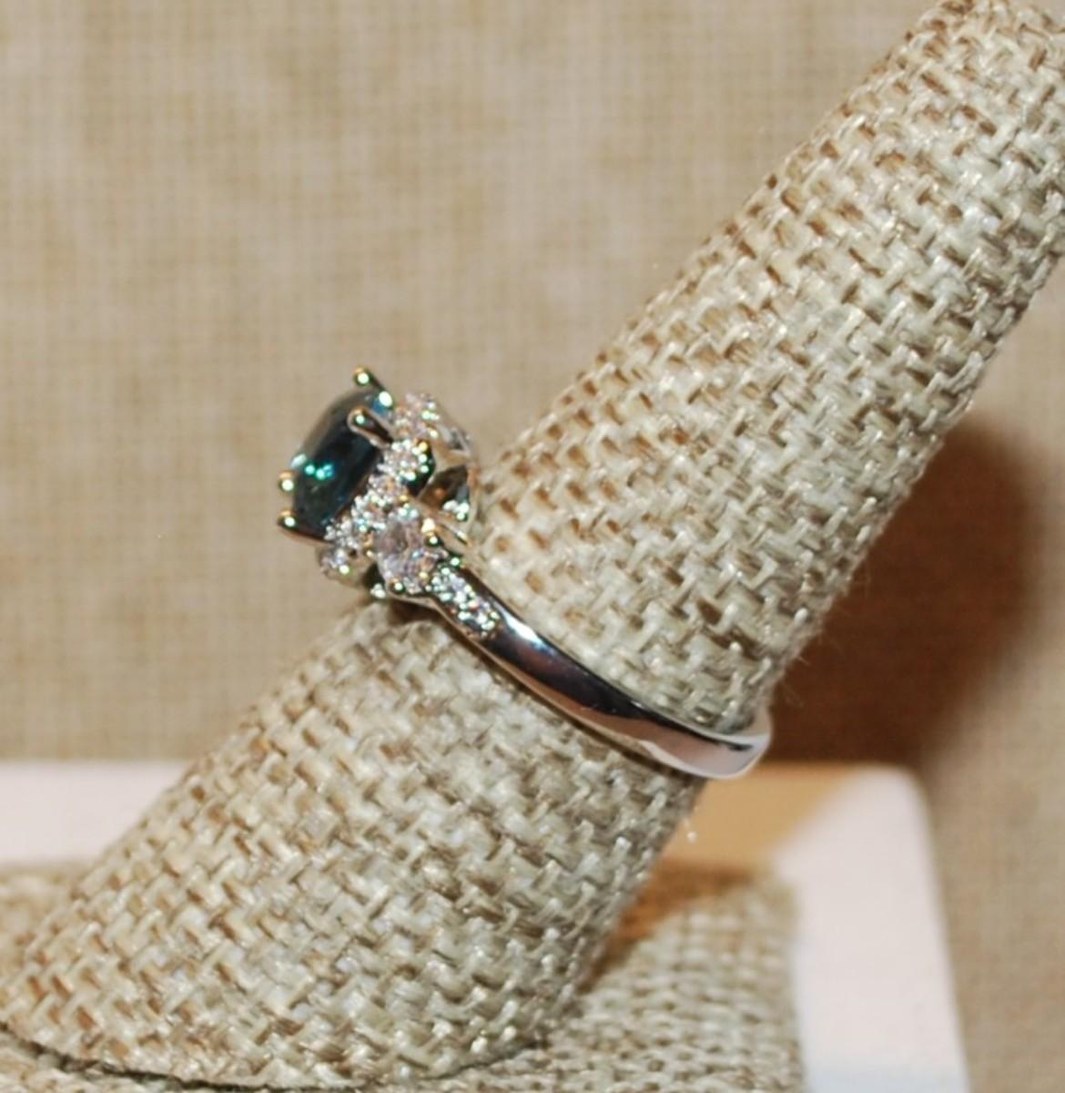 Size 7¼ Blue Transparent Azure Cut Stone with Full Surrounds & Side Accents on a Silver Tone Band (3.4g)