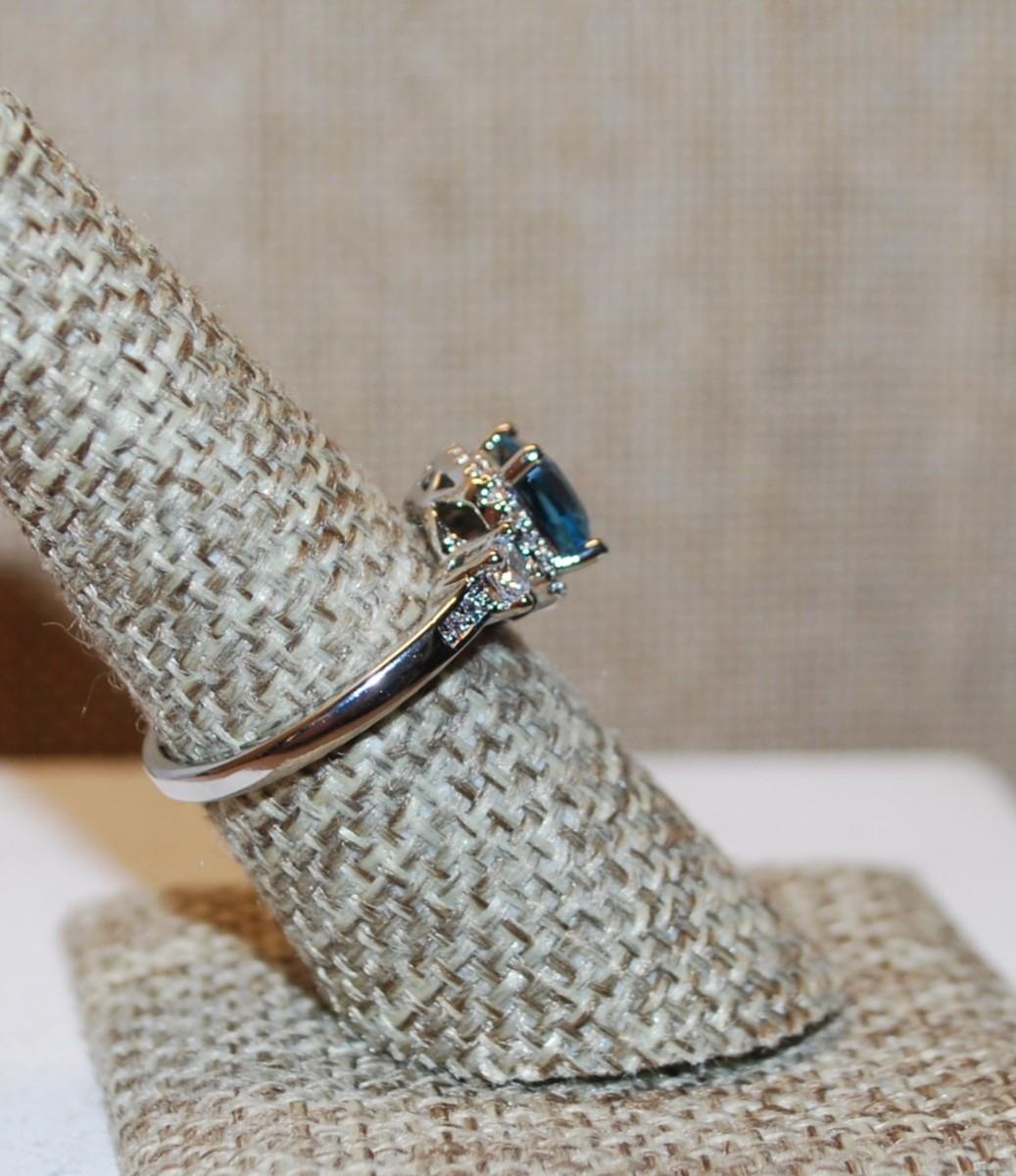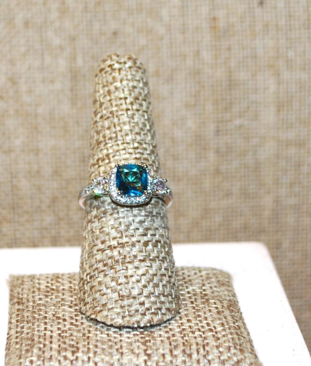 Size 7¼ Blue Transparent Azure Cut Stone with Full Surrounds & Side Accents on a Silver Tone Band (3.4g)