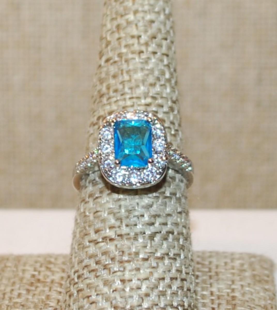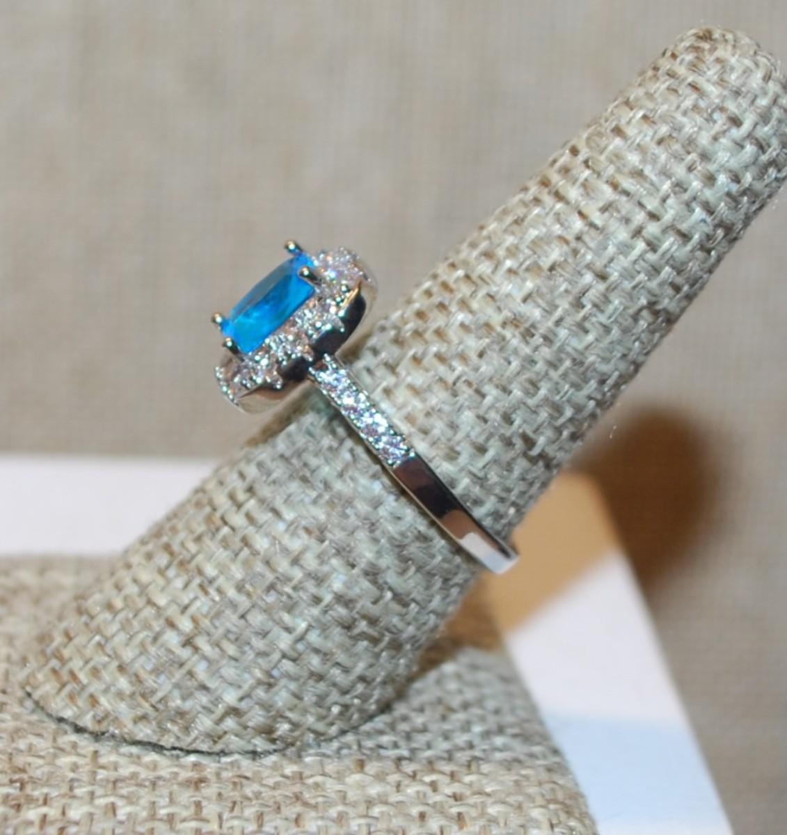 Size 7½ Blue Transparent Rectangle Stone Ring with Full Surround & 4 Stone Side Accents on a Silver Tone SPLIT BAND (4.3g)