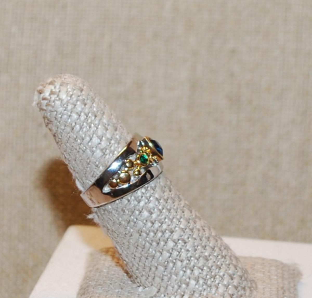 Size 7¼ Blue Trillion Cut Main Stone Ring with 2 Tone Accent on a Silver Band (4.2g)