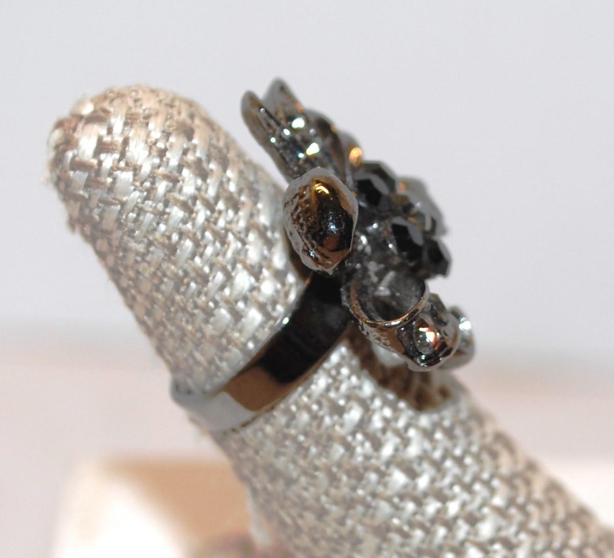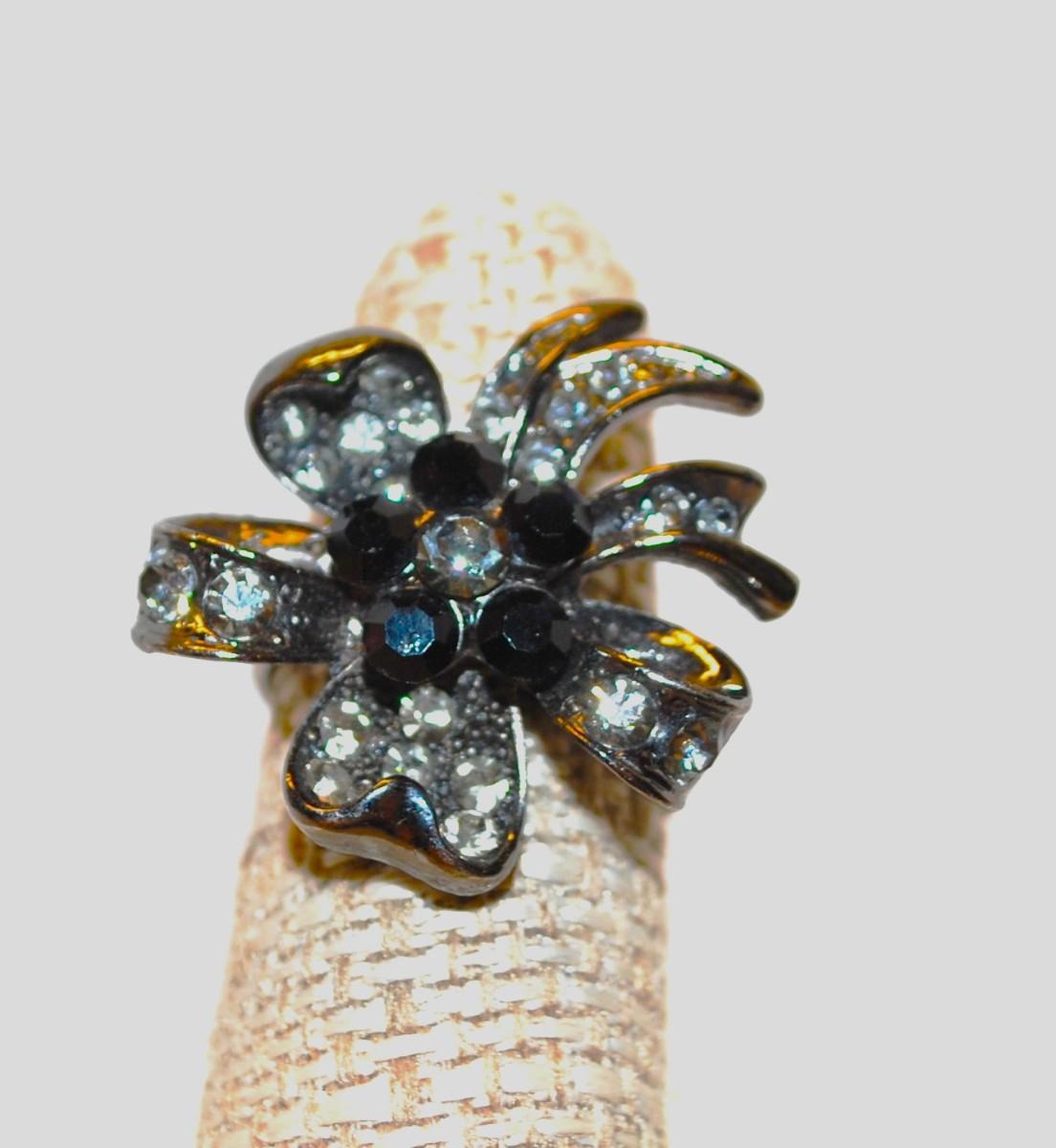 Size 7 Bowtie Split-Band Ring with Centered 5 Black Stones and Clear Stones Surround (9.4g)