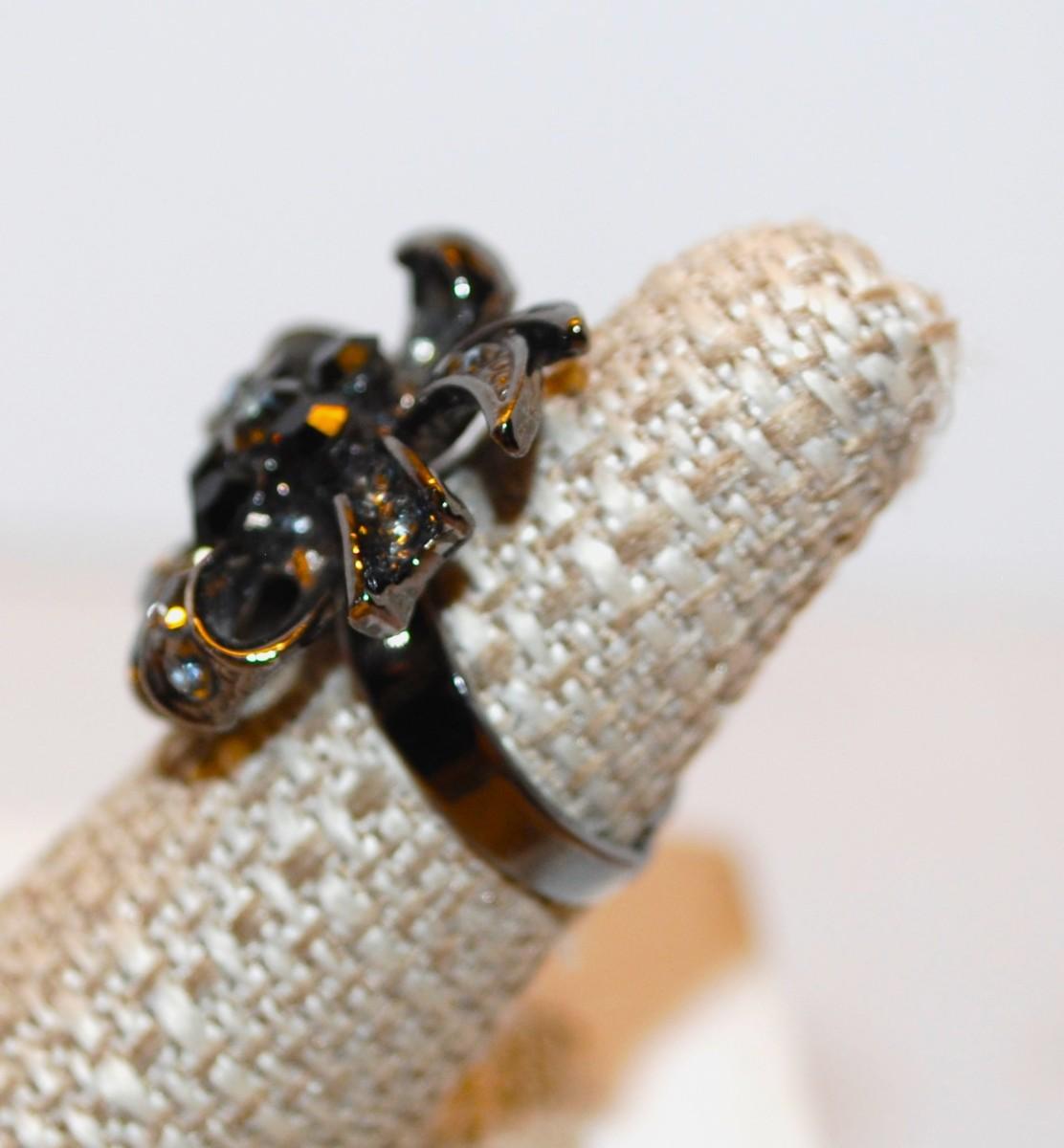 Size 7 Bowtie Split-Band Ring with Centered 5 Black Stones and Clear Stones Surround (9.4g)