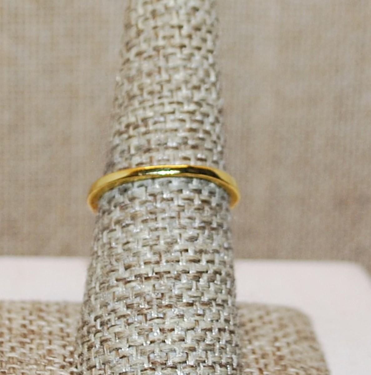 Size 7½ Bright Round Emerald GREEN 4 Prong Stone Ring on a Bright Gold Tone Band (1.8g)