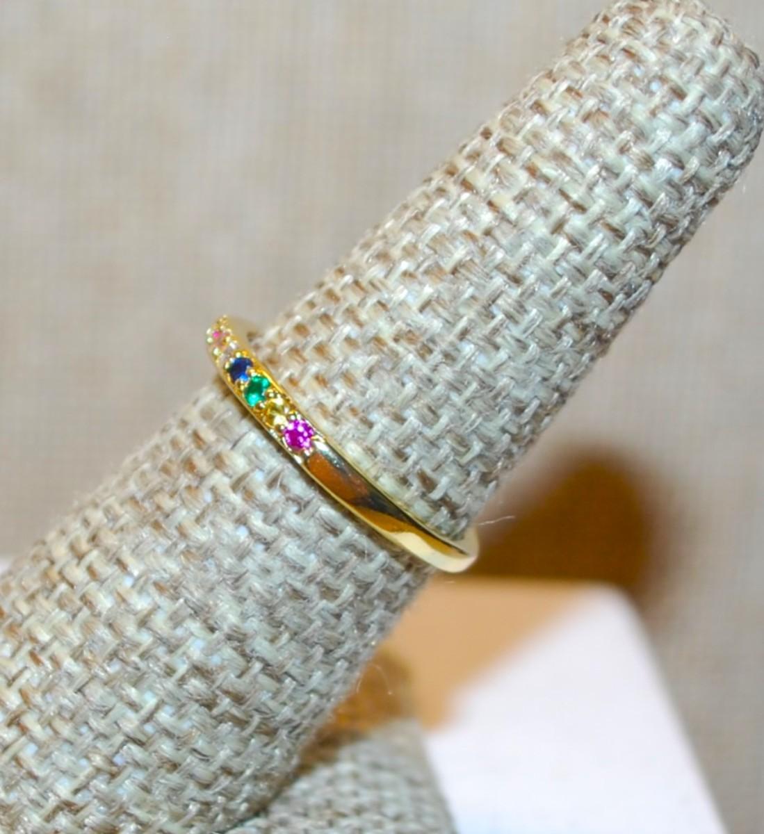 Size 7 Classic Multi-Color Red, Blue, Amber, Pink, Green & Clear Stones Ring on a Gold Tone Band (1.3g)