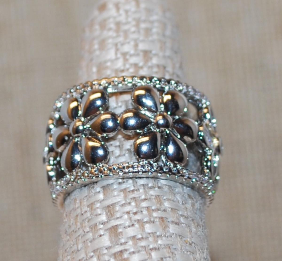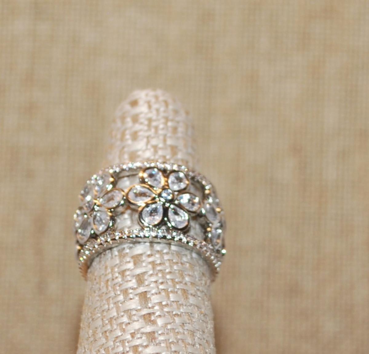 Size 7½ Clear Pear Shaped Stones Flower with 6 Petals Party Ring & Shiny Accents on a Silver Tone Band (8.2g)