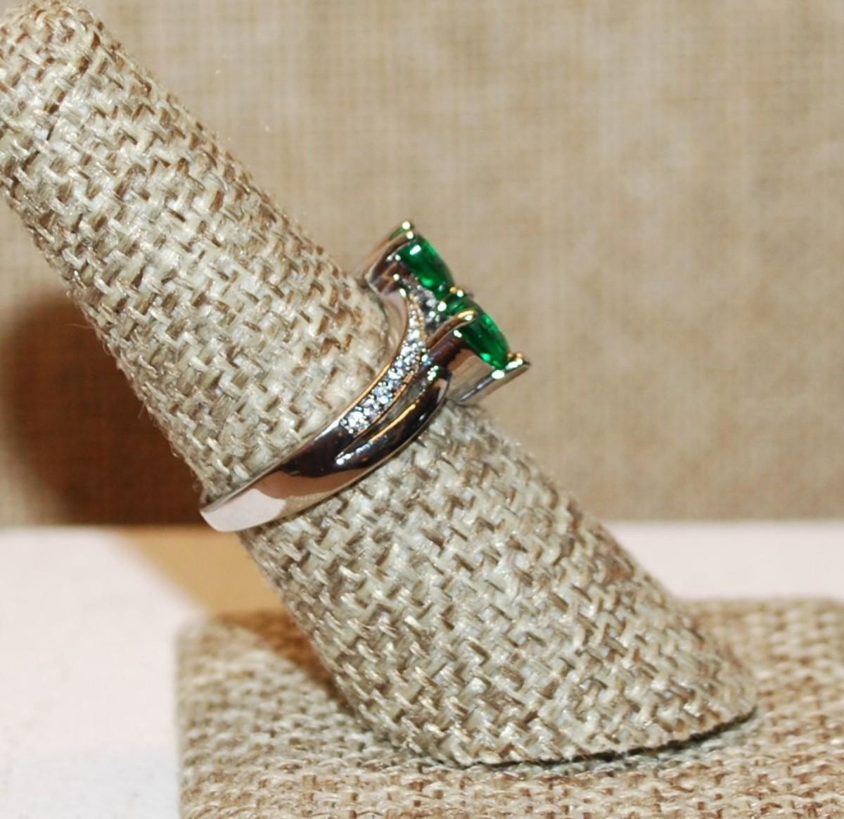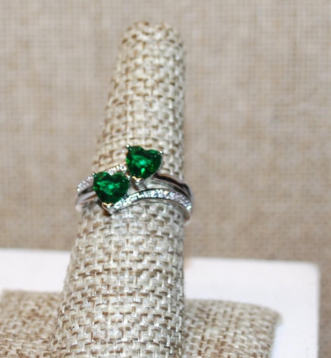 Size 7¼ Connected Green HEARTS Ring with Clear Stone Accents on a Silver Band (3.2g)