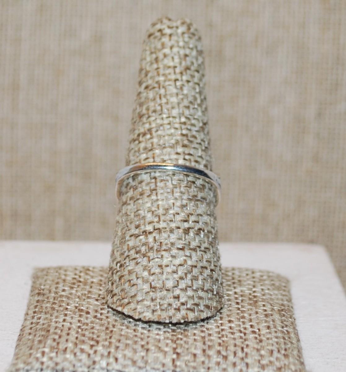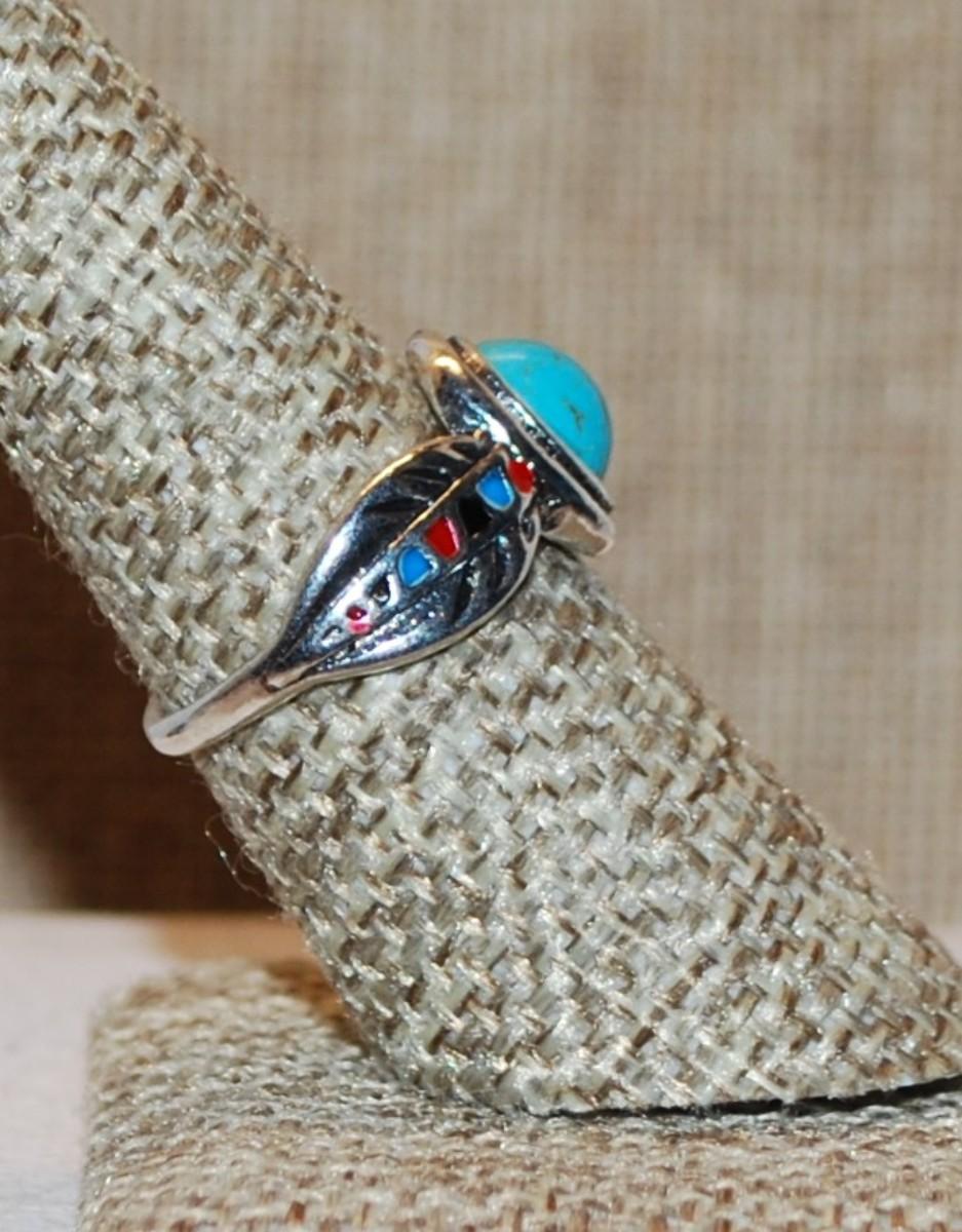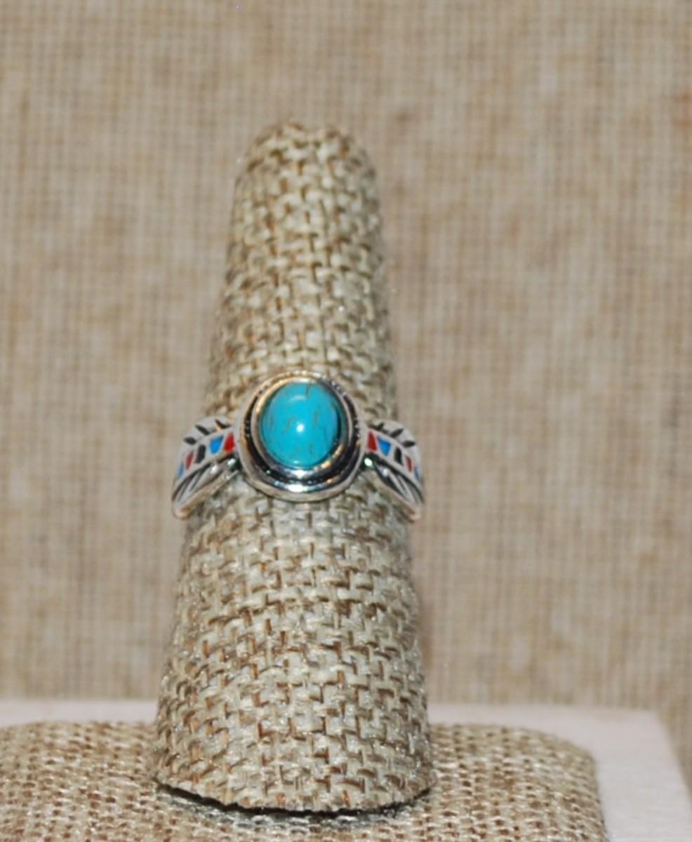 Size 7½ Cool Oval Crackled Style Turquoise Ring with Red, Blue & Black Side Inserts on a Silver Tone Band (4.0g)