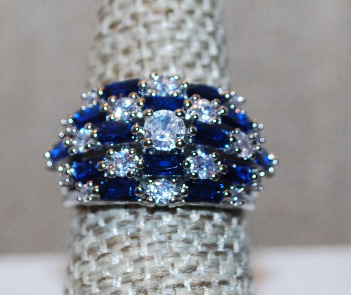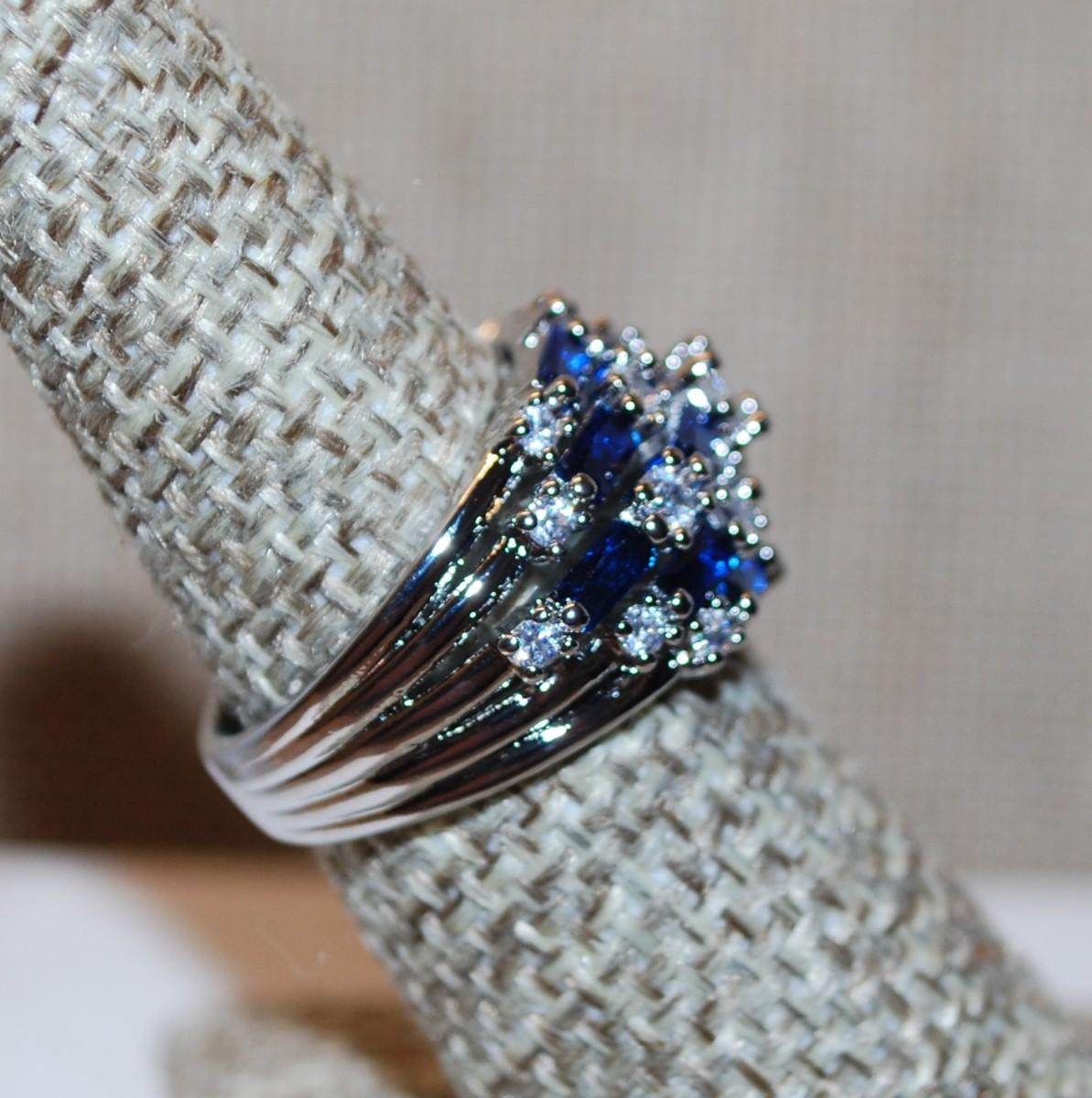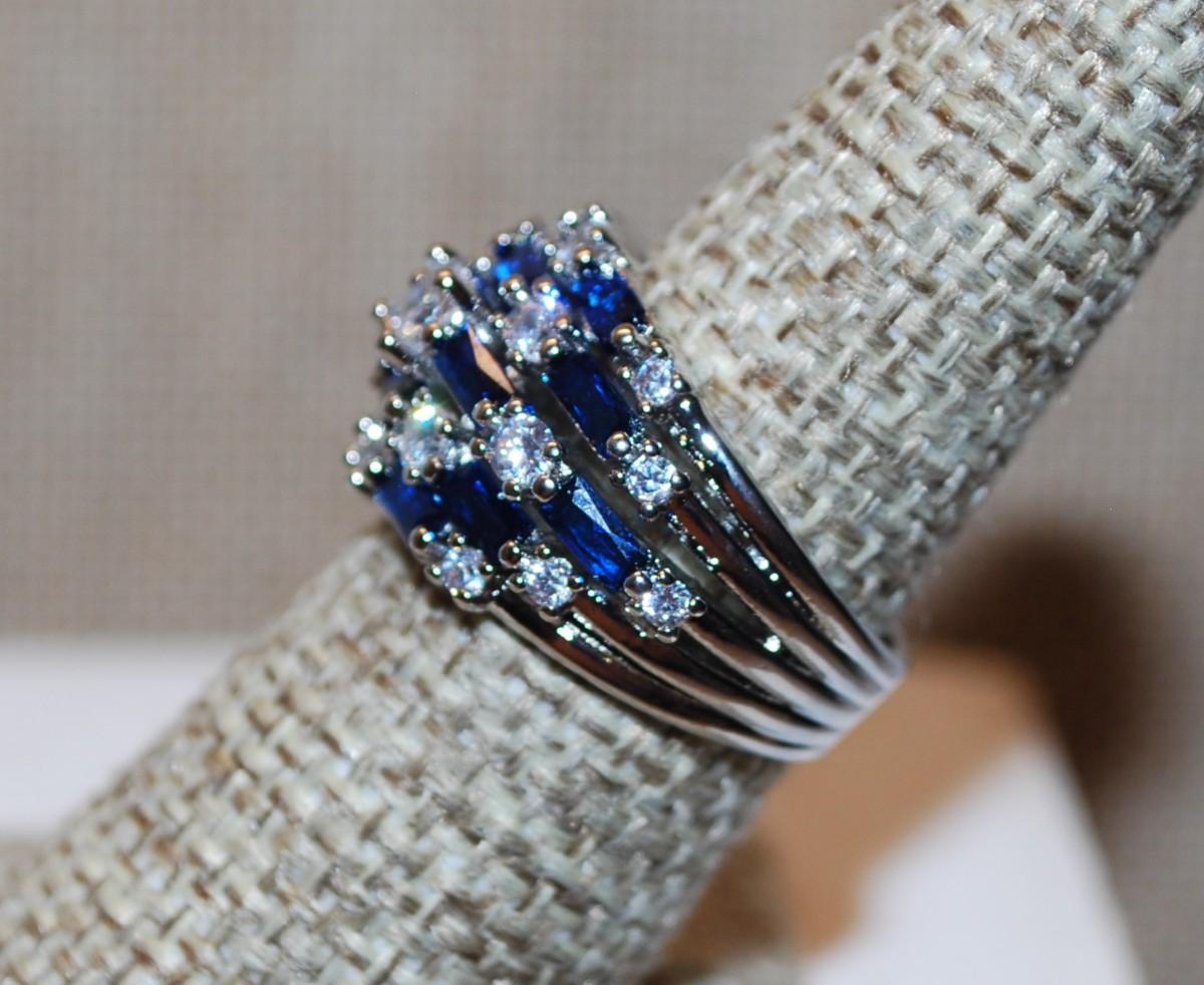 Size 7 Deep Blue & Clear Stones 5 Rows Marked .925 Silver Ring (6.3g)