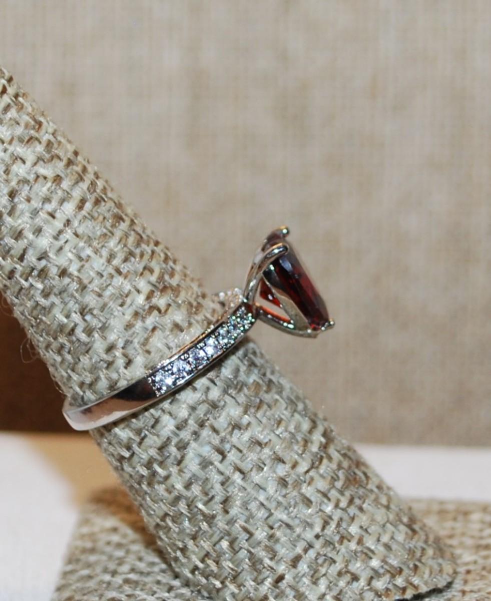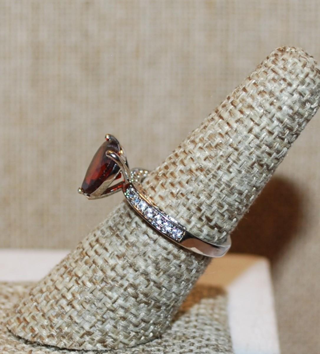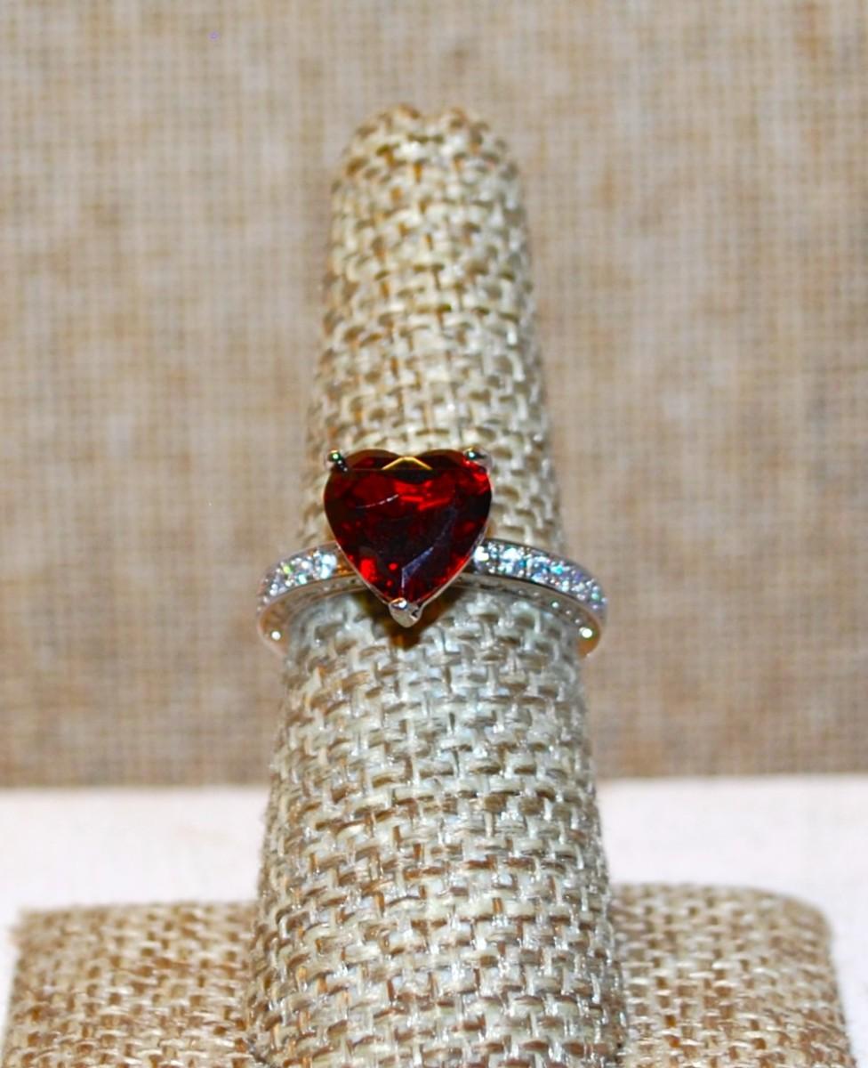 Size 7 Deep Red Heart Cut Ring with Side Accents on a Silver Tone Band (3.1g)