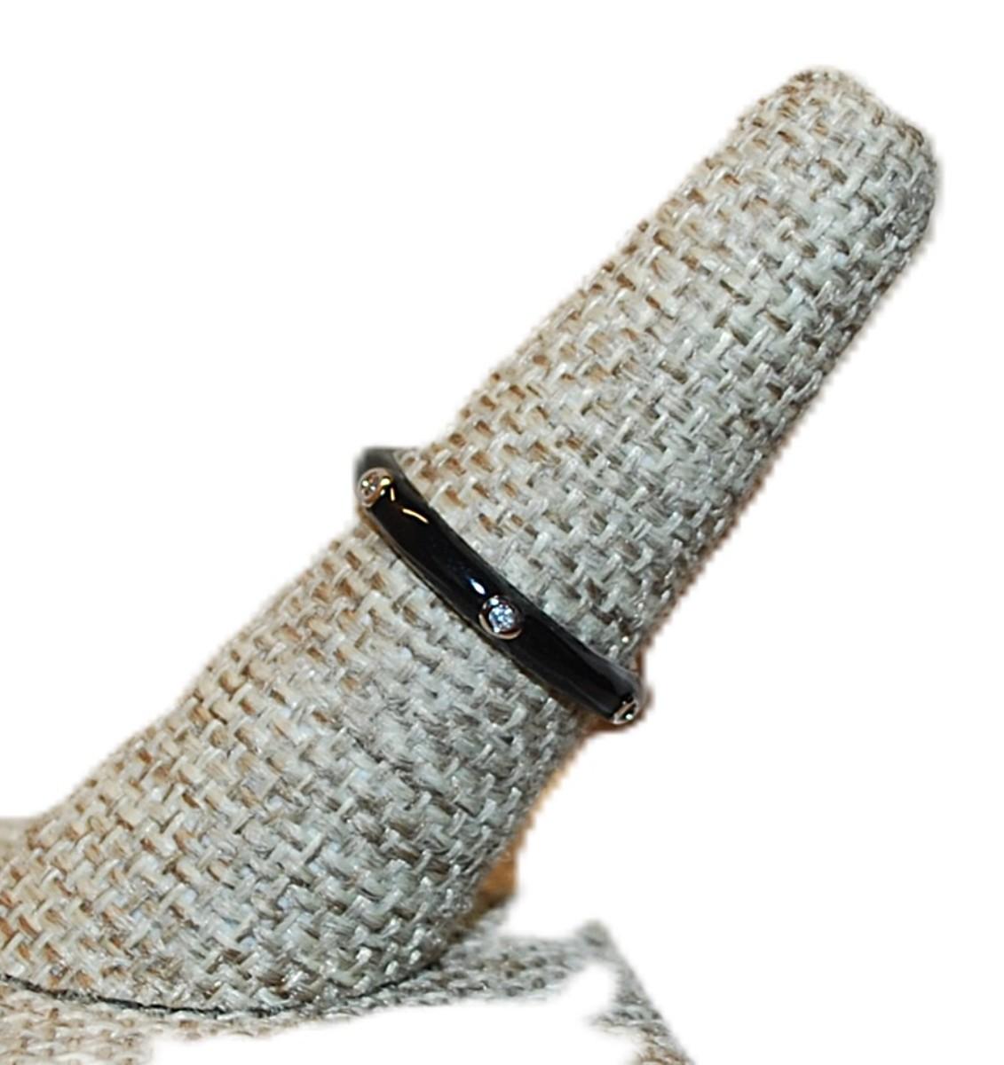 Size 7 Delicate BLACK Enamel Ring with 6 Accent Clear Stones on a Silver Tone Band (2.3g)