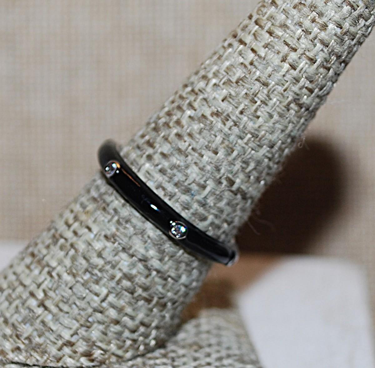 Size 7 Delicate black Enamel Ring with 6 Accent Clear Stones on a Silver Tone Band (2.2g) - STACK ALL COLORS for a REAL IMPACT