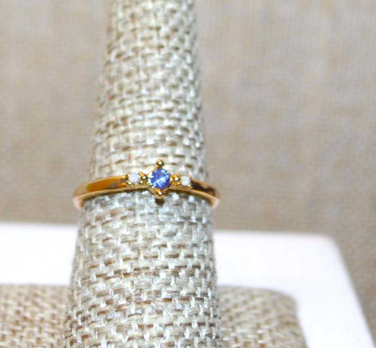 Size 7½ Delicate Tiny Blue Stone Ring with 2 White Opaque Stone Accents on a Gold Tone Band (1.6g)