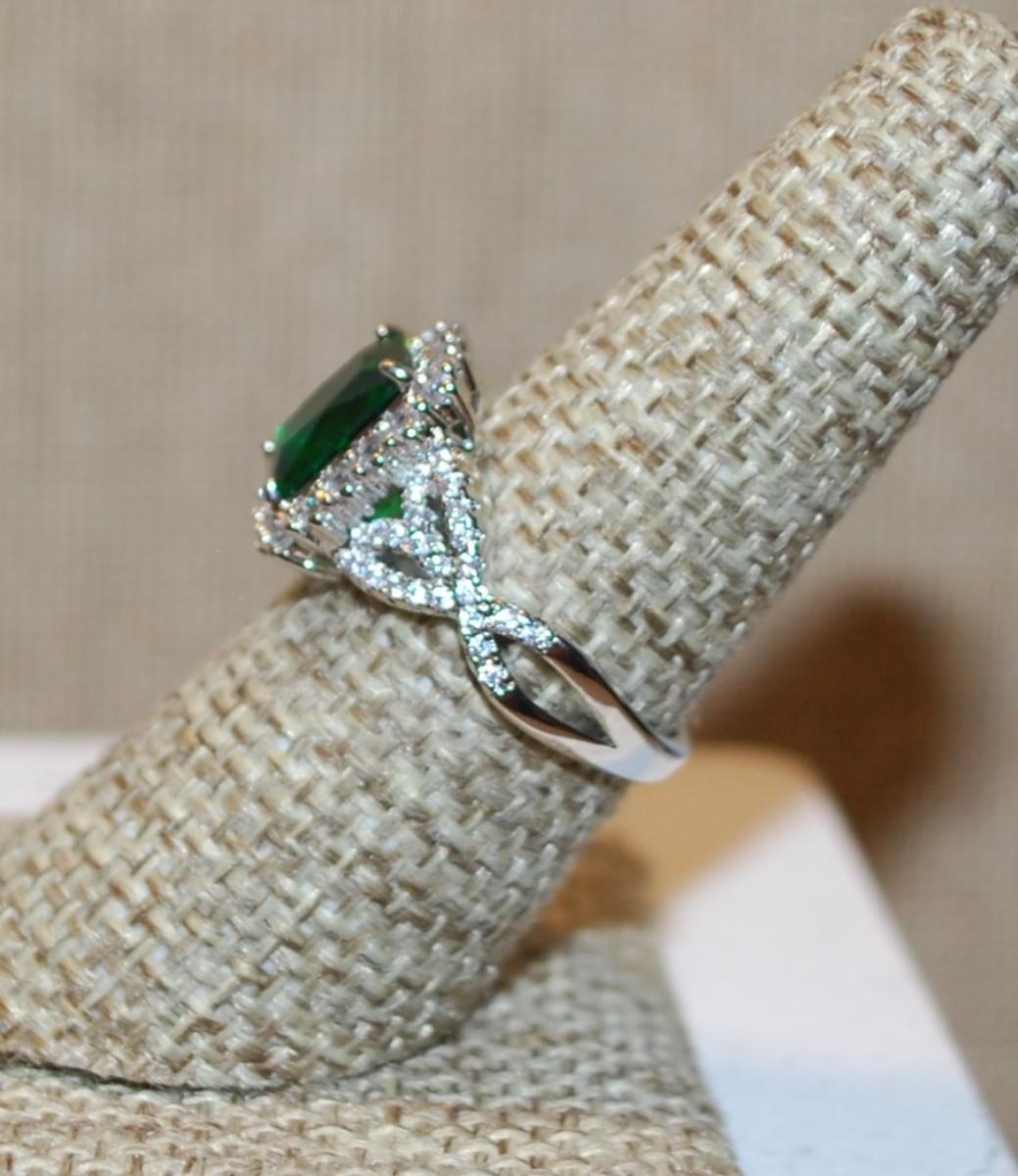 Size 7 Emerald Cut Green Stone Ring with Full Surround & Side Accents on a Silver Tone Band (4.3g)
