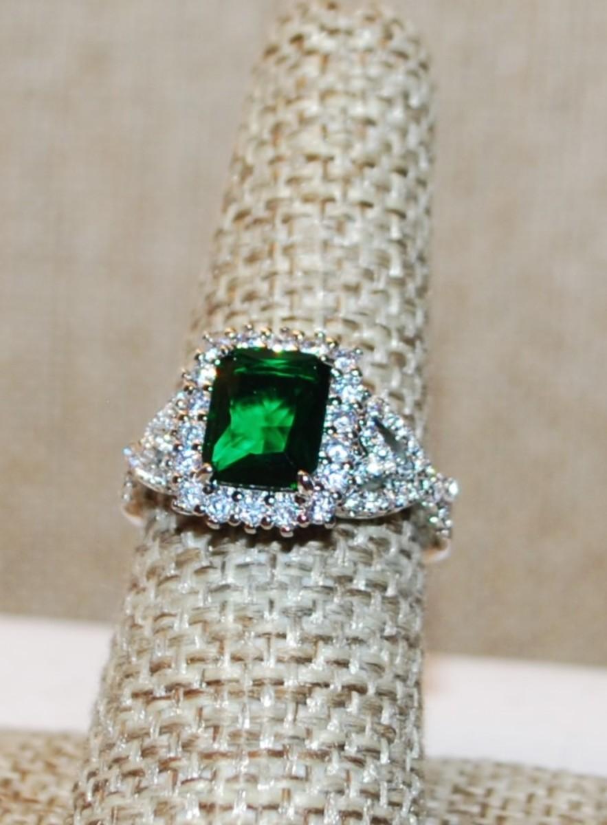 Size 7 Emerald Cut Green Stone Ring with Full Surround & Side Accents on a Silver Tone Band (4.3g)