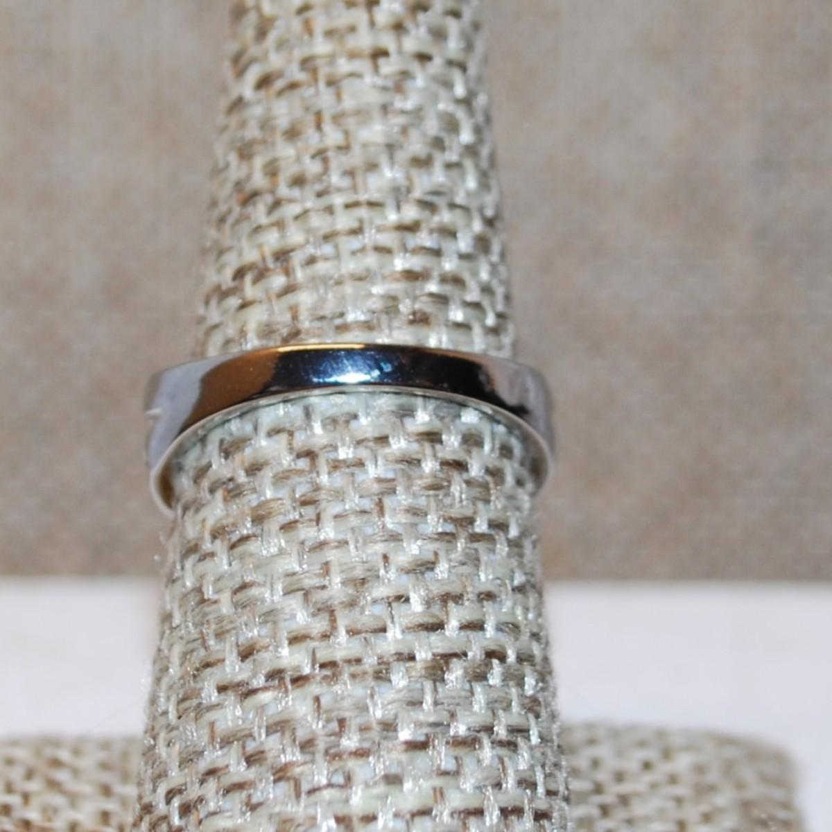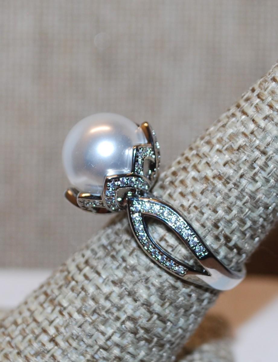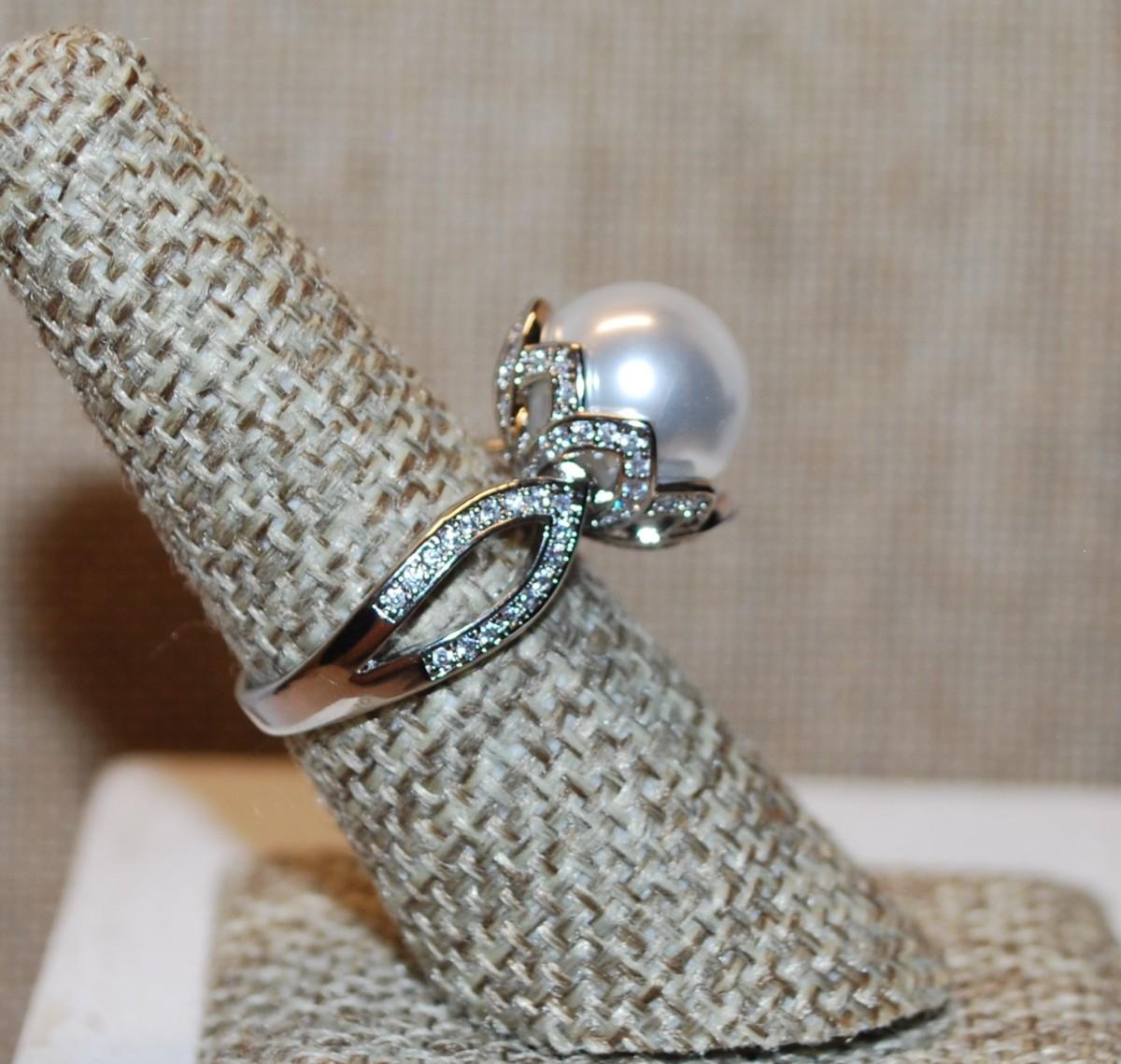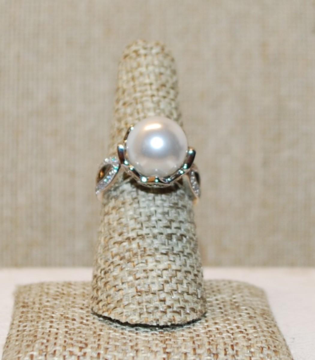 Size 7½ Faux White Pearl Set in a "Crown Cradle" with Side Accents on a Silver Tone Band (5.2g)