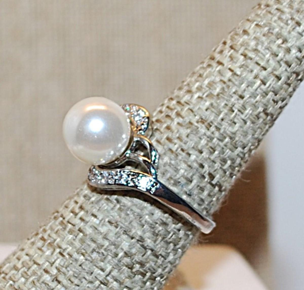 Size 7½ FAUX White PEARL Ring with Swirl Clear Stones Sides Ring on a Silver Tone Band (3.5g)